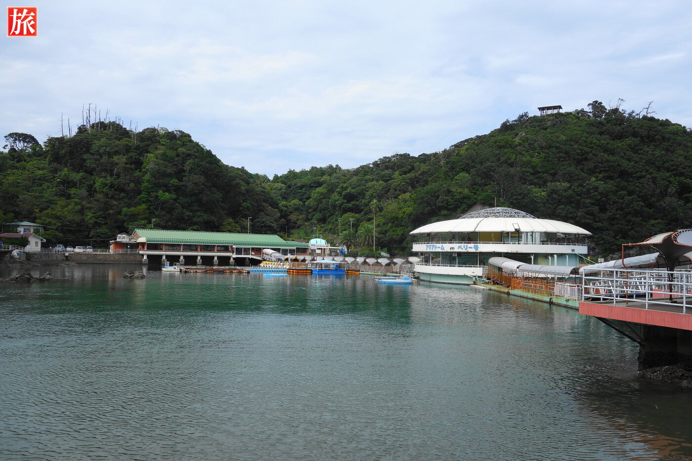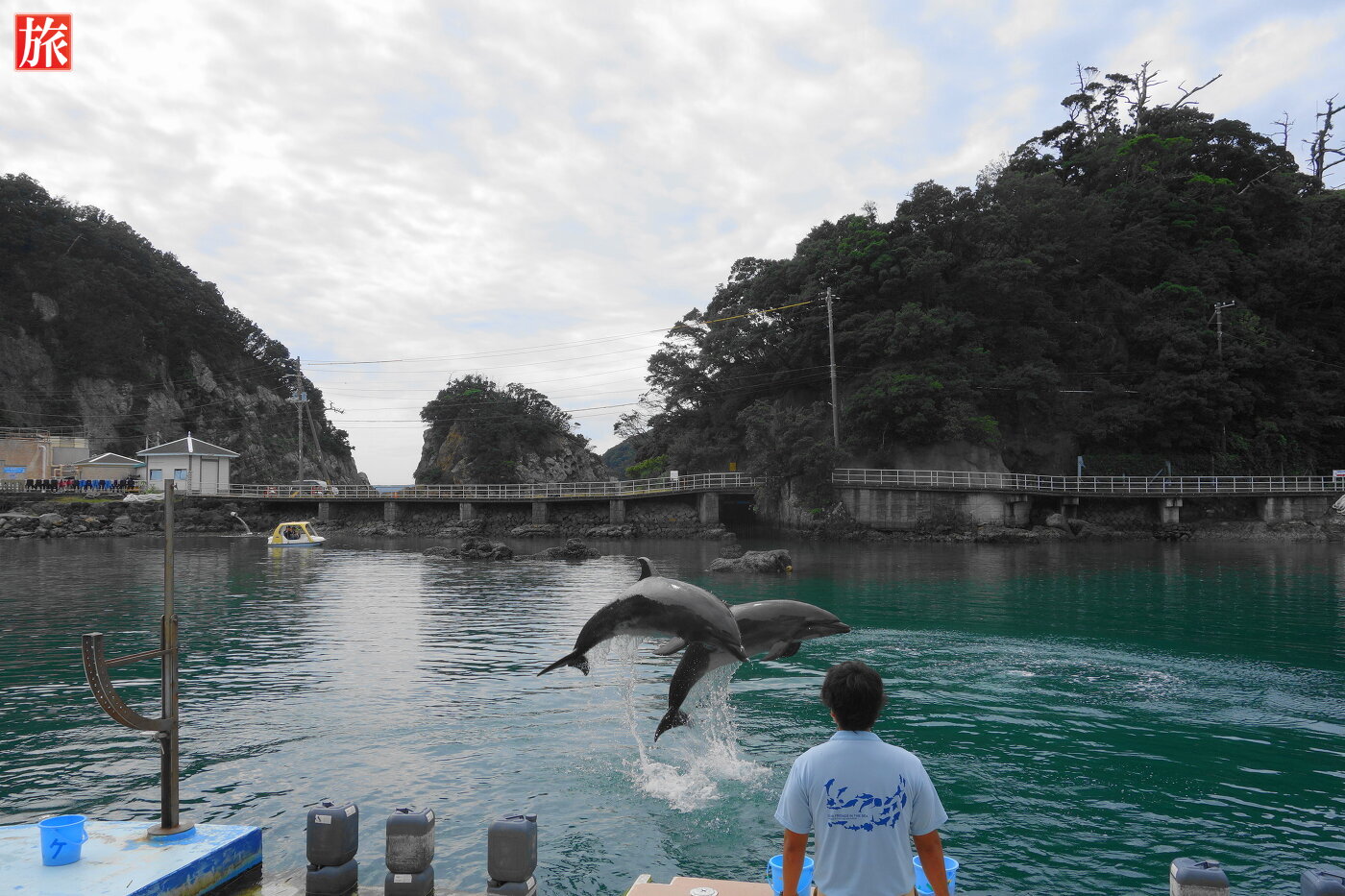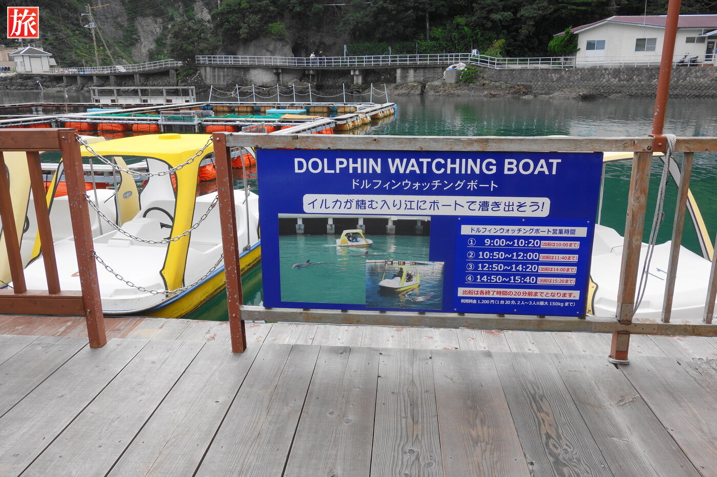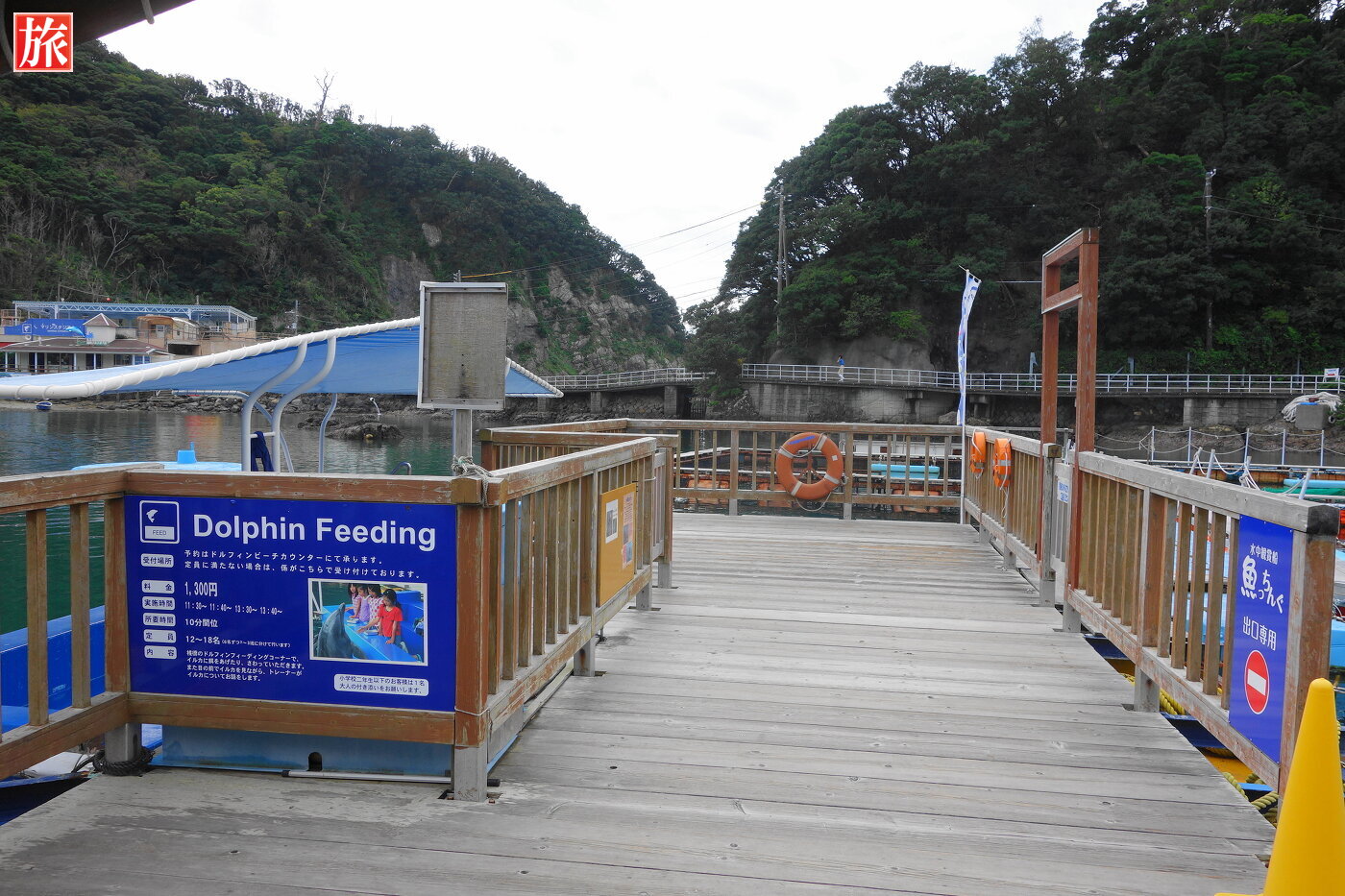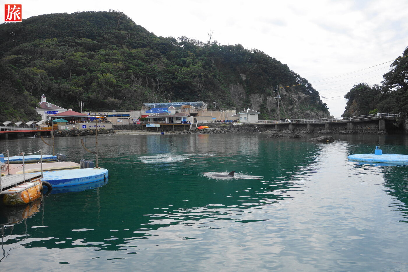 ドルフィンウォッチングボート乗り場。ドルフィンフィーディング「直接エサをあげたり:1300円」することもできます。入り江を泳ぐイルカさん・・・