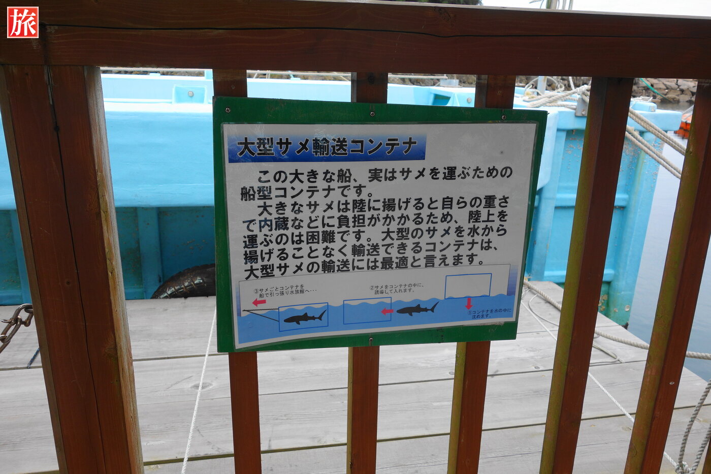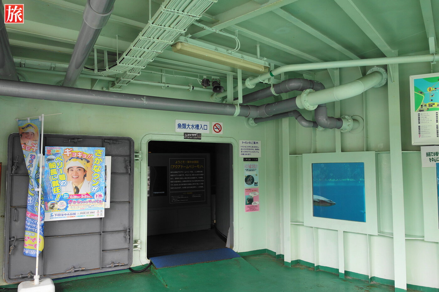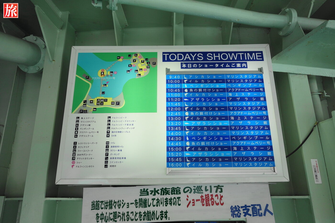 魚類大水槽入口。浮き桟橋を振り返った様子。ショータイムのご案内。