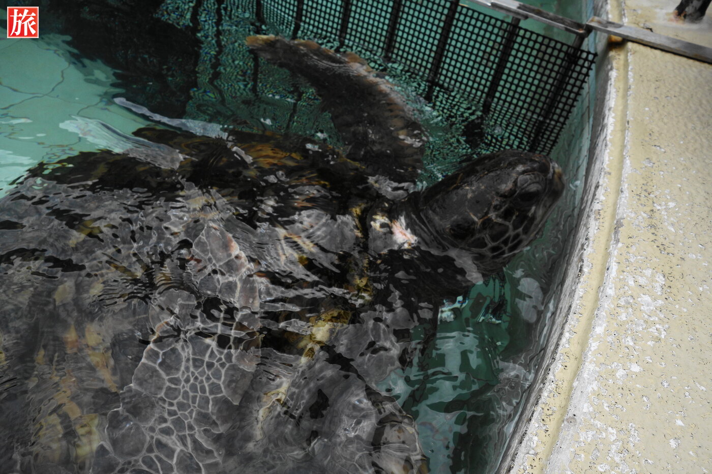 下田海中水族館入口正面。入口手前のカメ池に暮らす、ウミガメ。