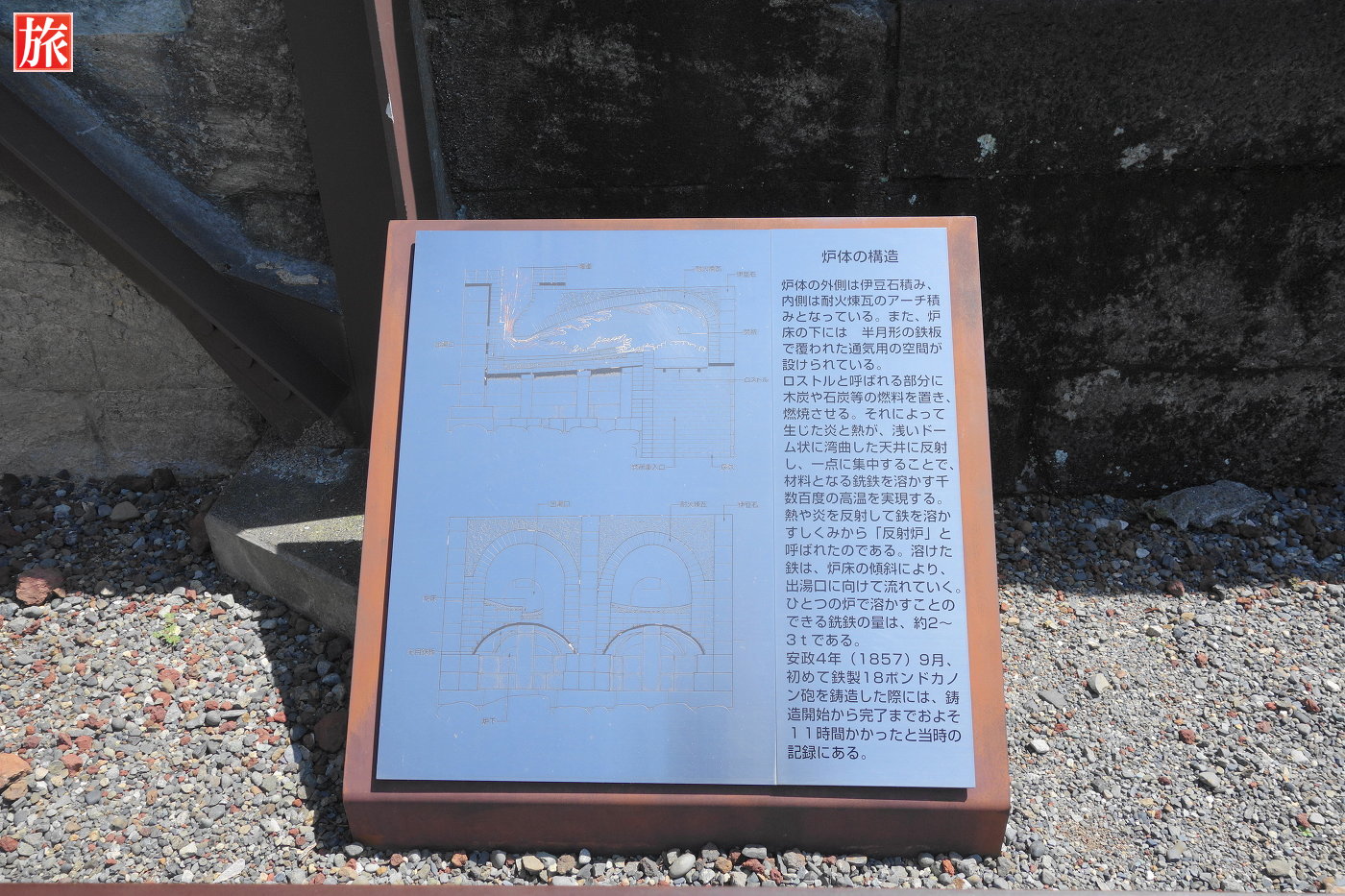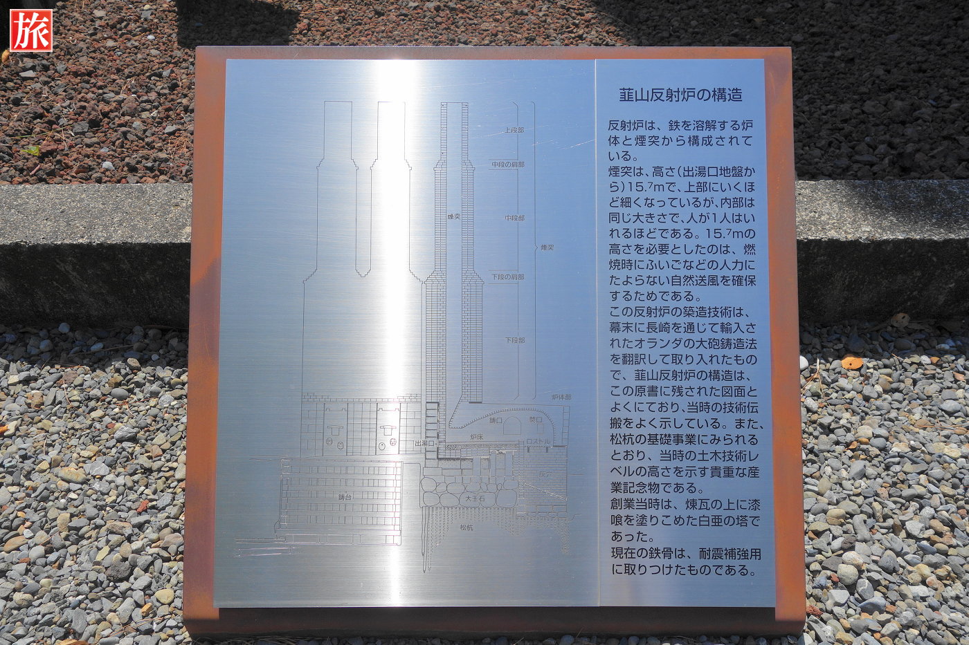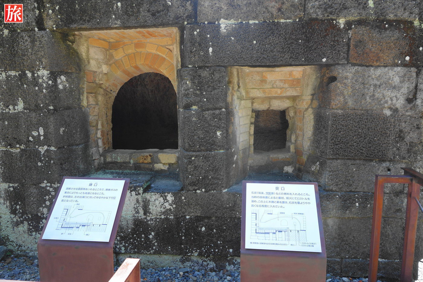4基の反射炉の外側は伊豆石、煙突部分は3段構造で125段のレンガが積まれ、煙突を含め高さは約16m。内側は耐火レンガのアーチ積み。天井に熱を反射させて一つに集中し、金属を溶かす構造。ここで鋳造された大砲は品川台場に配備された。