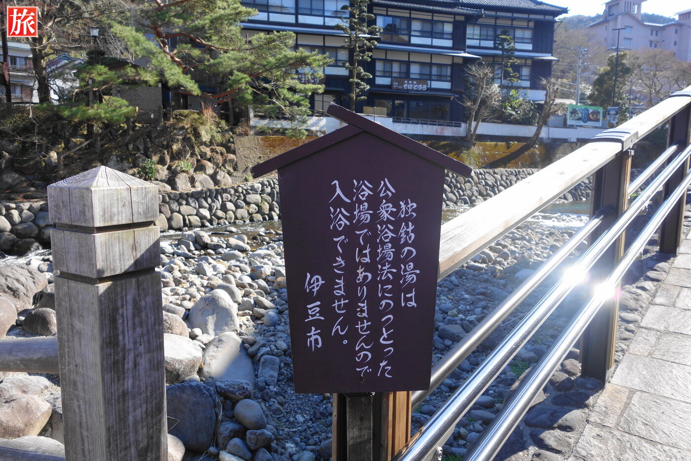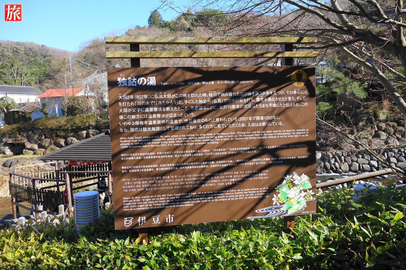 現在入浴が禁止とされ、足湯として多くの方に利用されています。泉質は、無色透明、無味無臭の単純温泉。修善寺川(桂川)の川中にあり、大きな石や岩を土台にし浴槽をかさ上げし、湯を楽しめるようになっています。