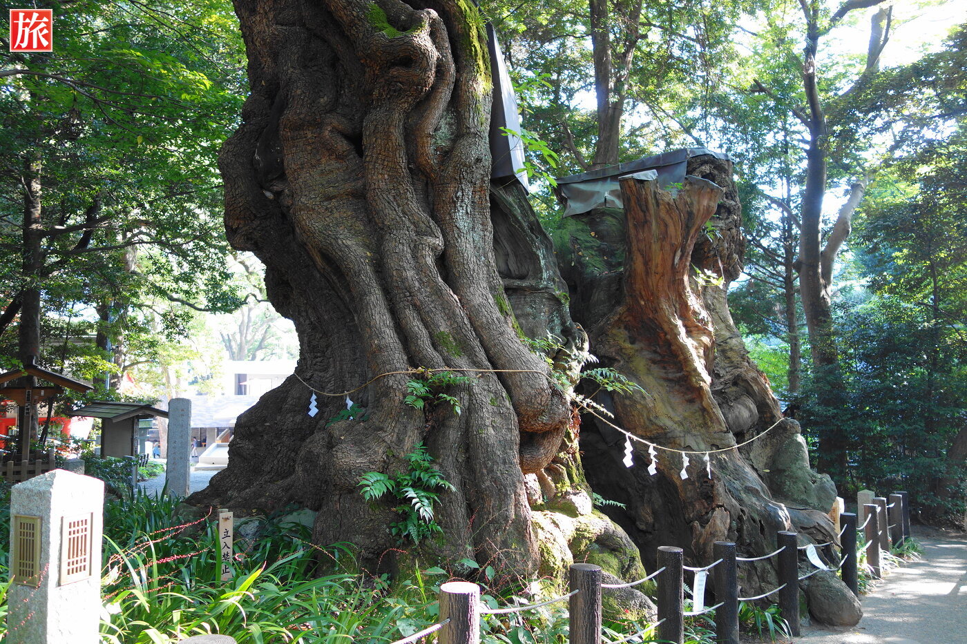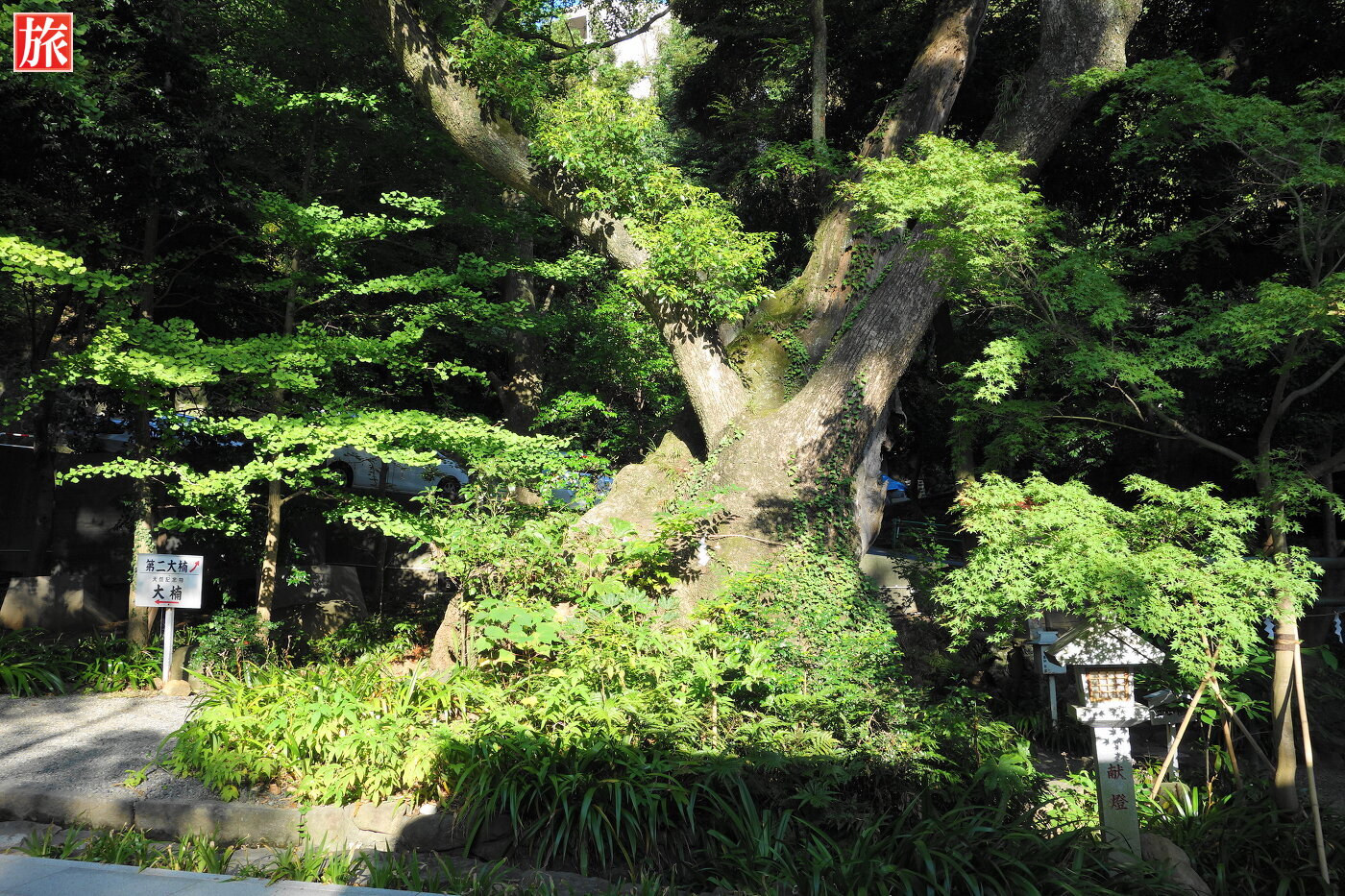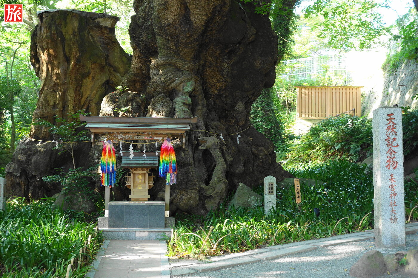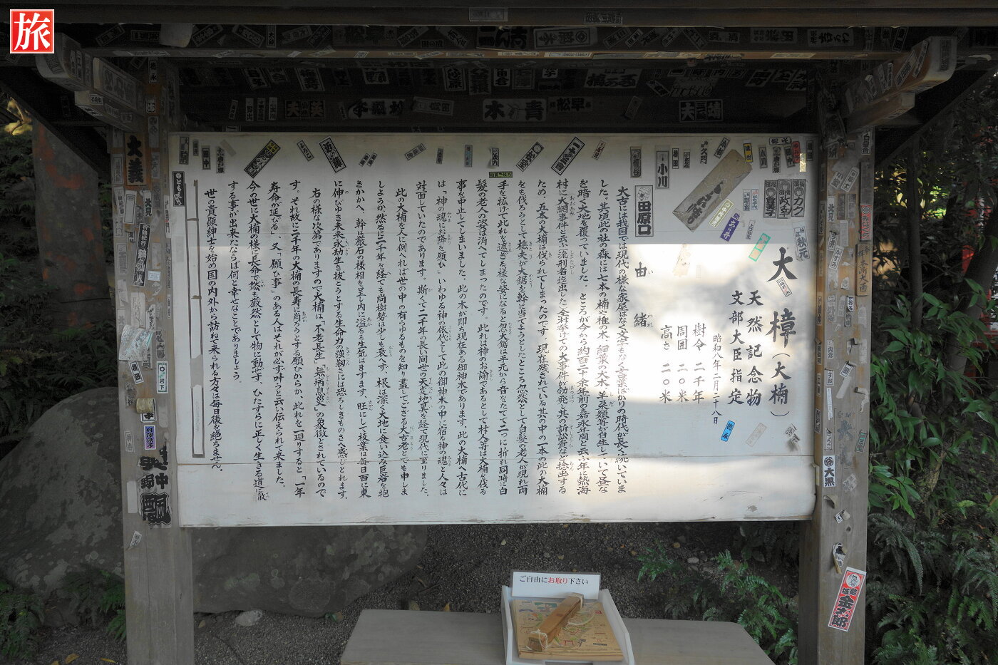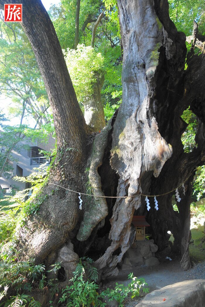 社殿の奥にある「ご神木・大楠」は国内屈指のパワースポットとして知られています。「ご神木・大楠」は昭和8年2月に日本最樹齢の樟として国の天然記念物に指定されています。裏手には糸川が流れ、山の気と水の気の両方を持つパワースポットで、テレビや雑誌、本でも多数取り上げられています。