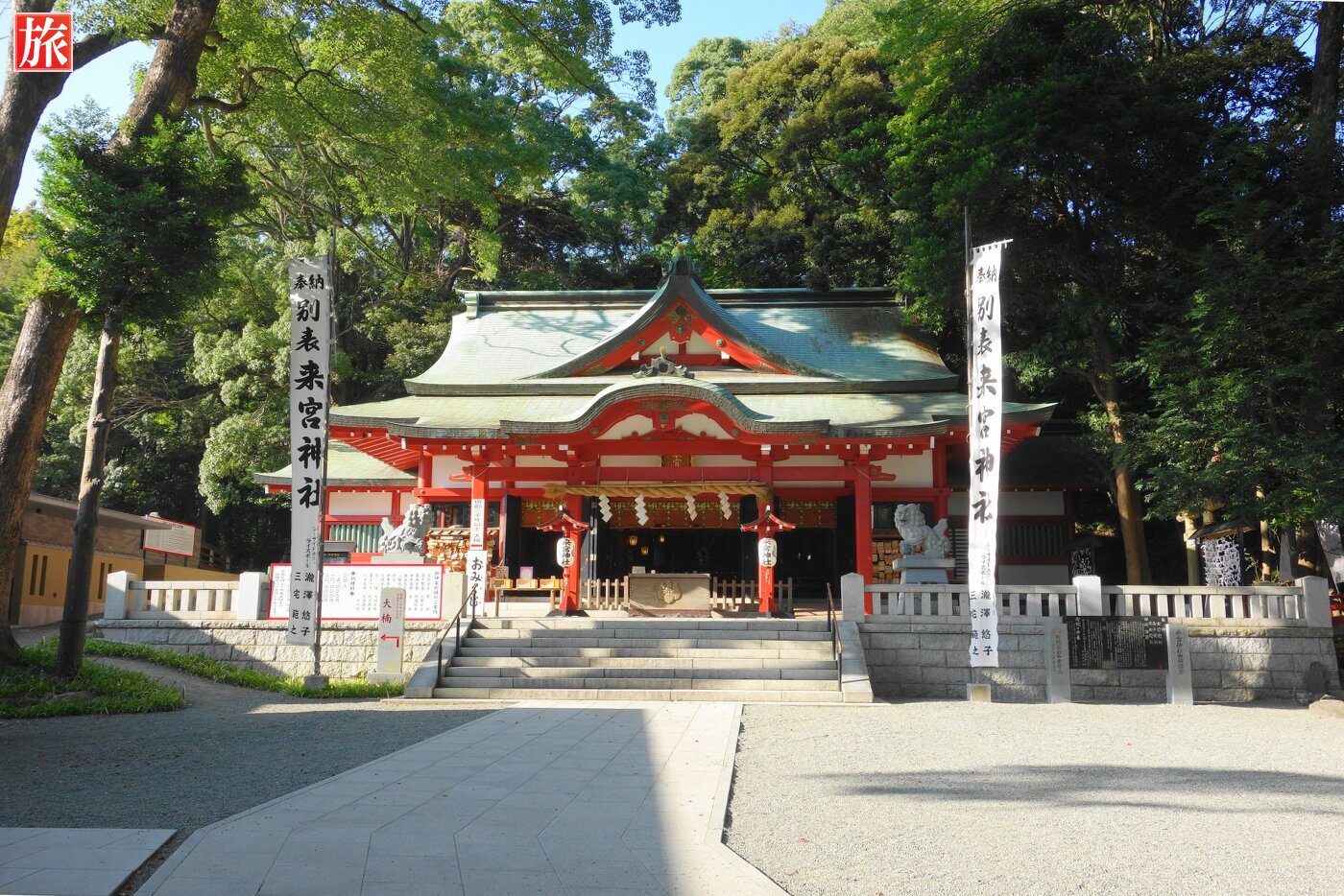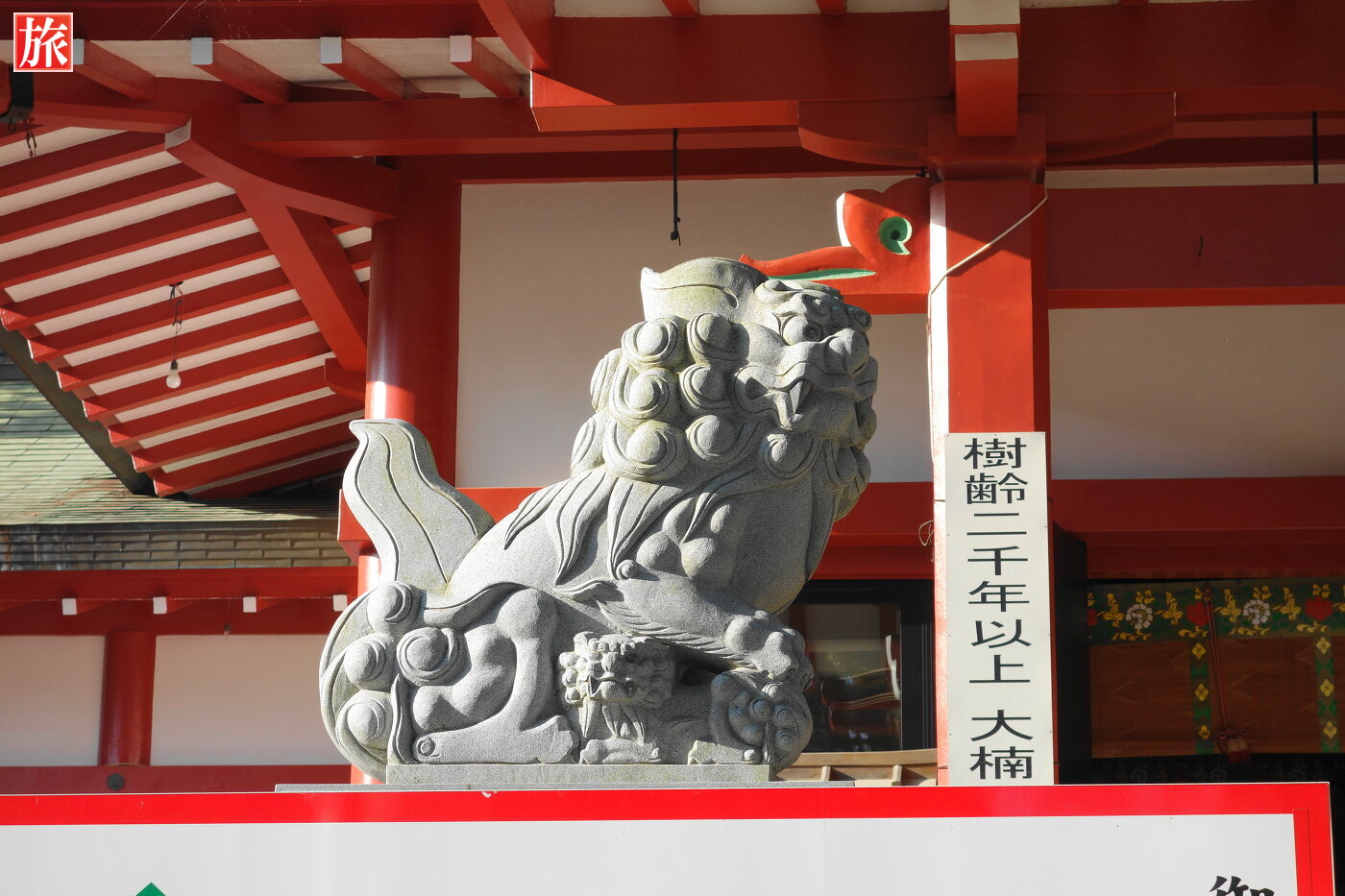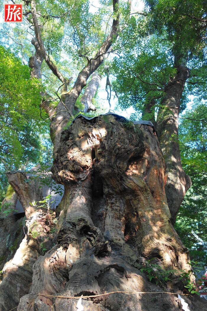 うっそうとした木々に囲まれて重厚な社殿が立つ。社殿の裏手にある大楠(天年記念物)は推定樹齢2000年以上で、樹高26m、幹の周囲が24mある。1周すると1年間長生きするという。