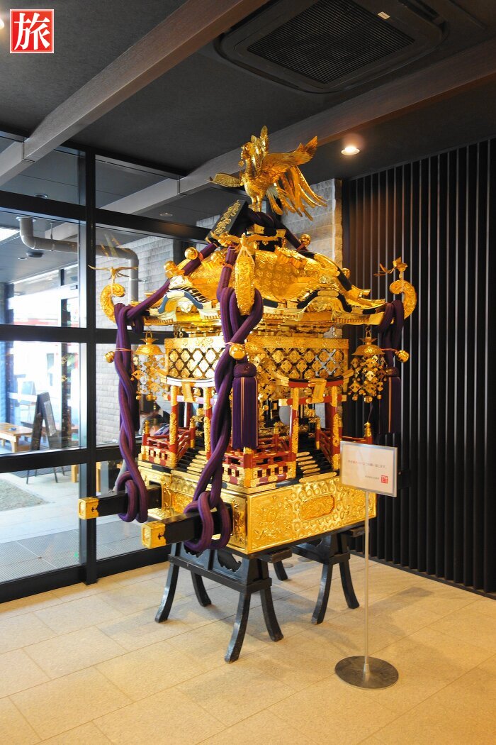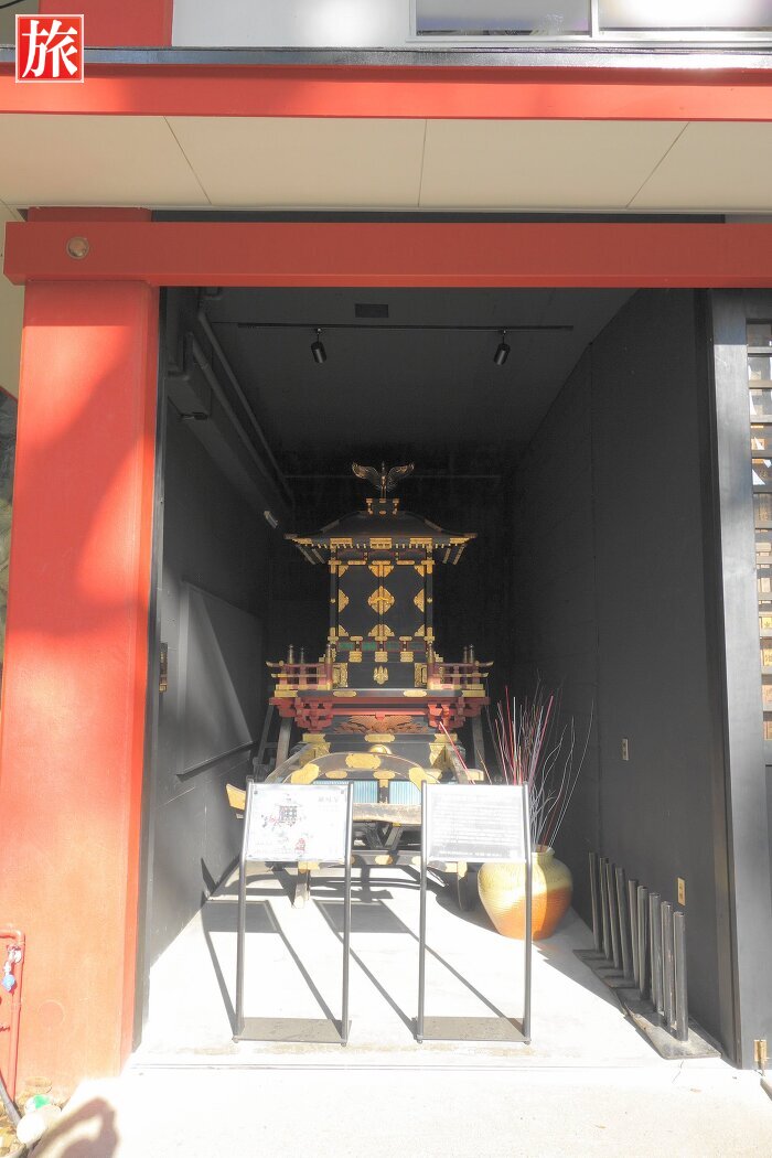 境内左手にある参集殿。殿内は神札・御守り授与所や大広間、祈祷待合室などがありOpen Cafe 「茶寮 報鼓 houko」併設しています。参集殿内にあった宮神輿。