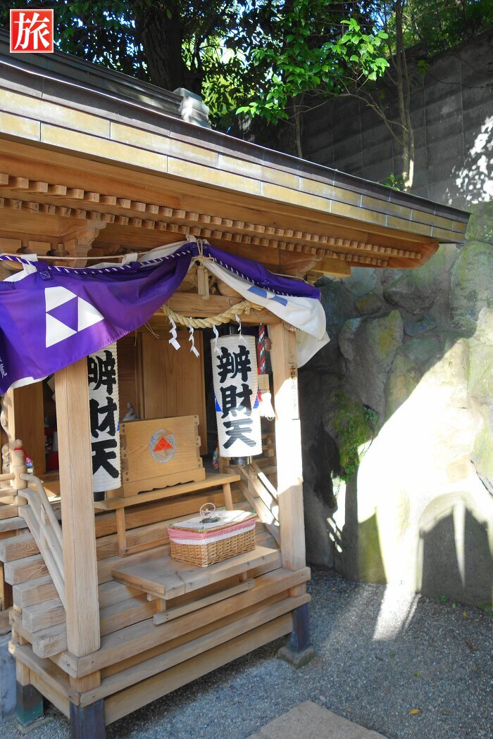 拝殿右手に来宮神社由緒沿革の書かれた案内石。されに奥には来宮弁財天(辨財天)があります。