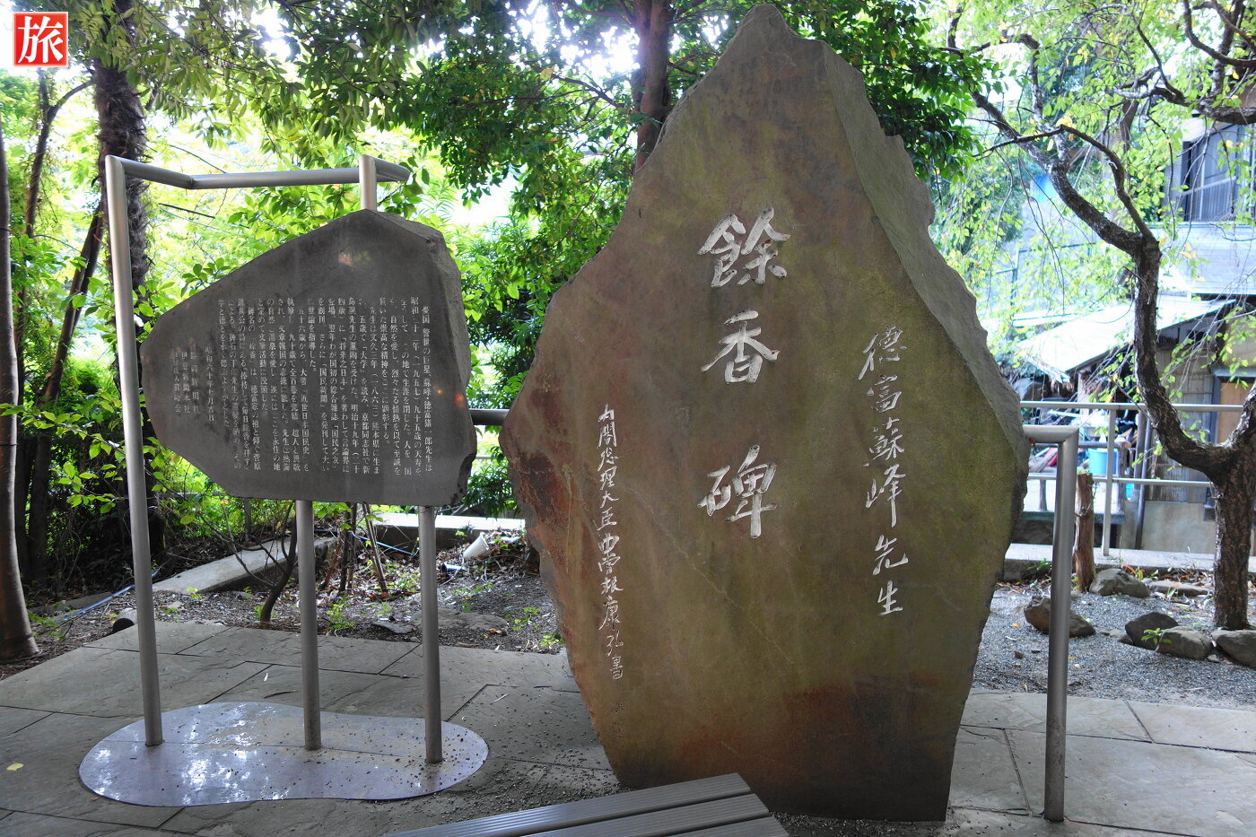 第一大楠を見上げる。大楠脇にあった徳富蘇峰 餘香碑。