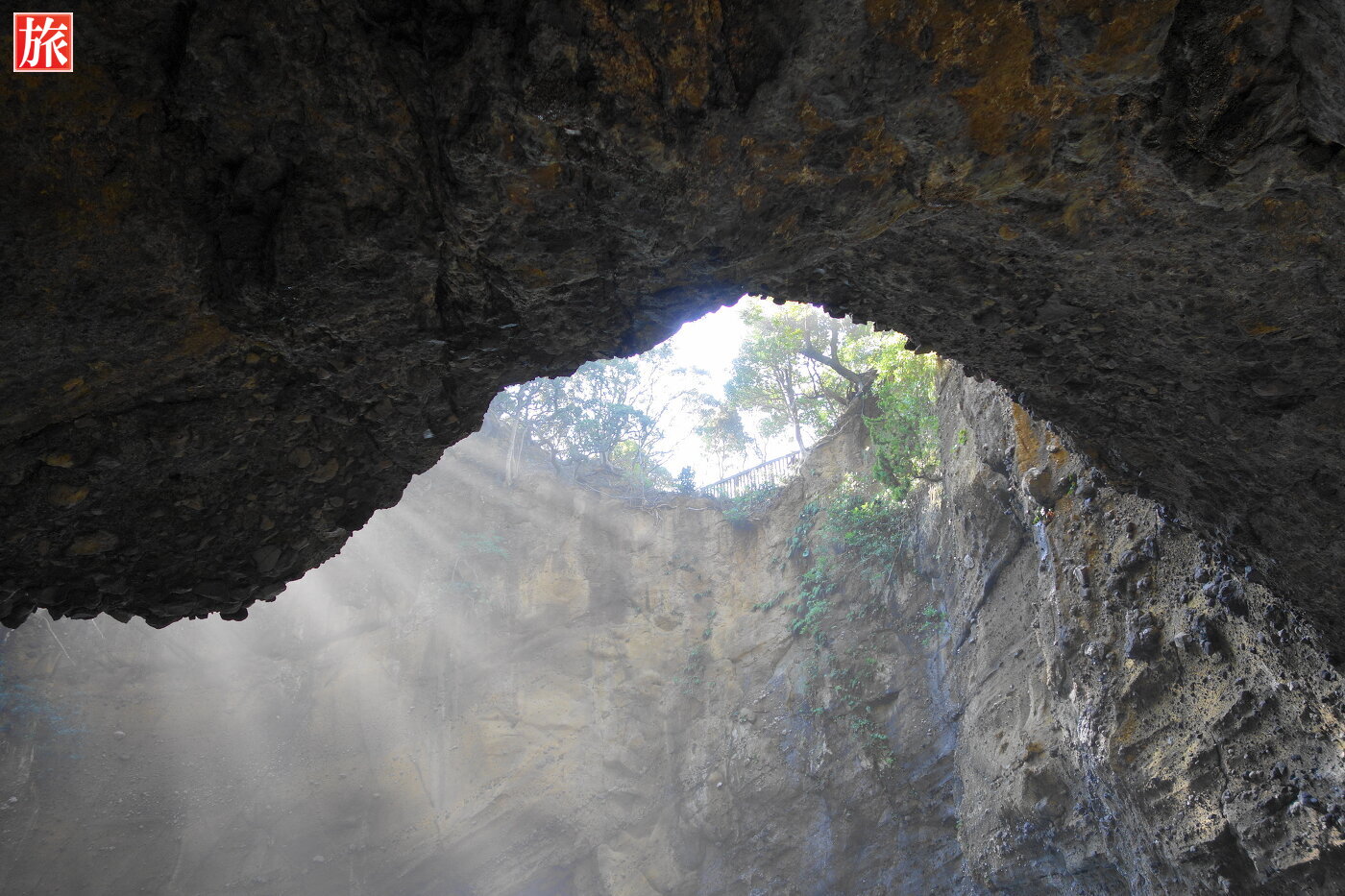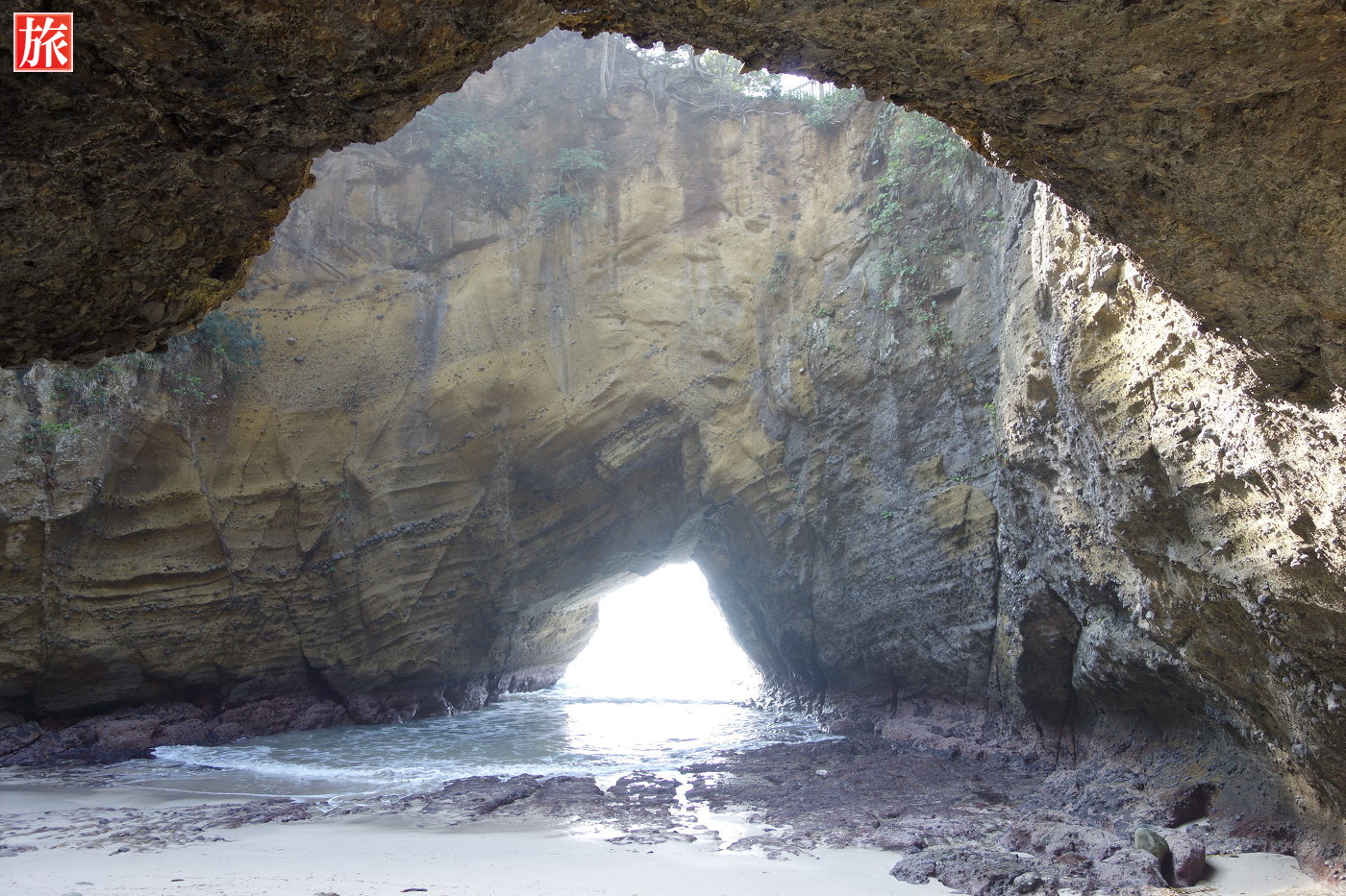直径約25mの楕円形天窓は神秘的で見ごたえあり。干潮時にはなんと洞窟の内部が小さなビーチに変身。天窓は神秘的で、上からのぞくとハート型に見えるので、カップルに人気がありデートコースに最適。