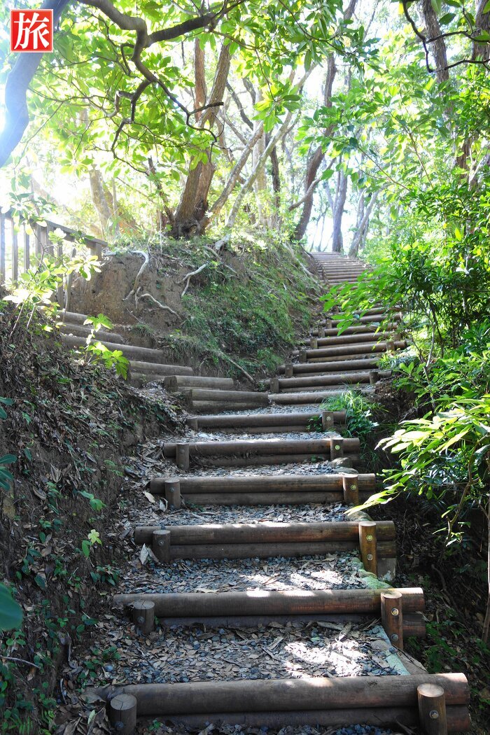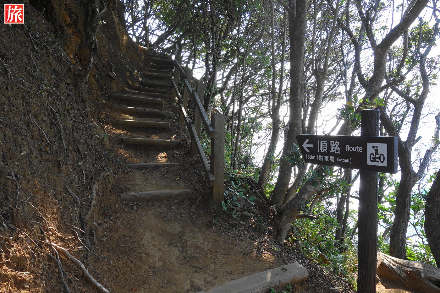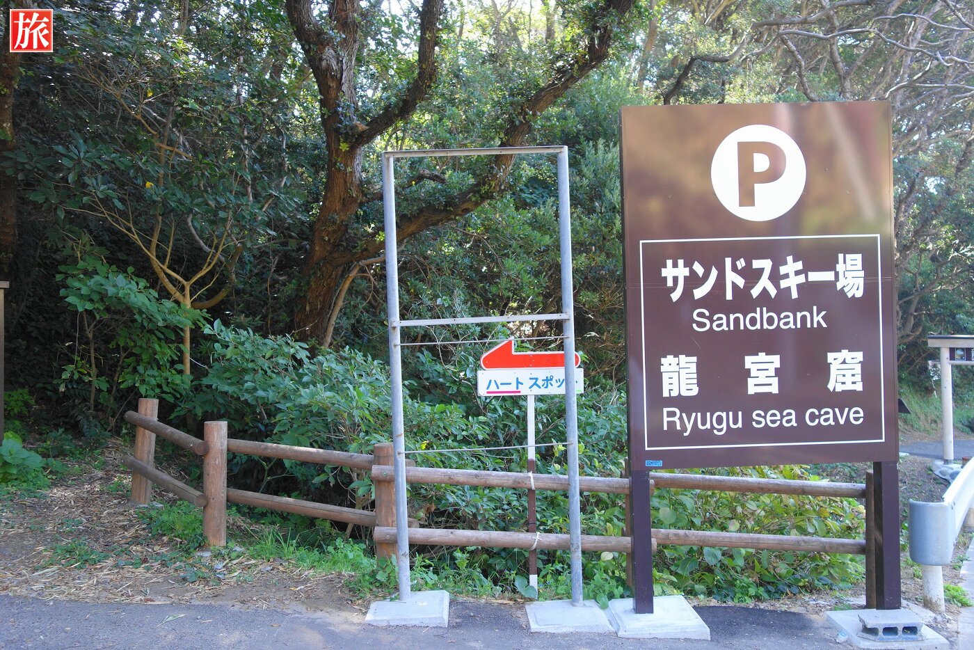 竜宮窟とサンドスキー場の案内。駐車場付近の様子。ハートビュースポット方向は遊歩道を右周りで進みます。階段を上っていきます。途中、龍宮窟を展望できるスペースも用意されています。
