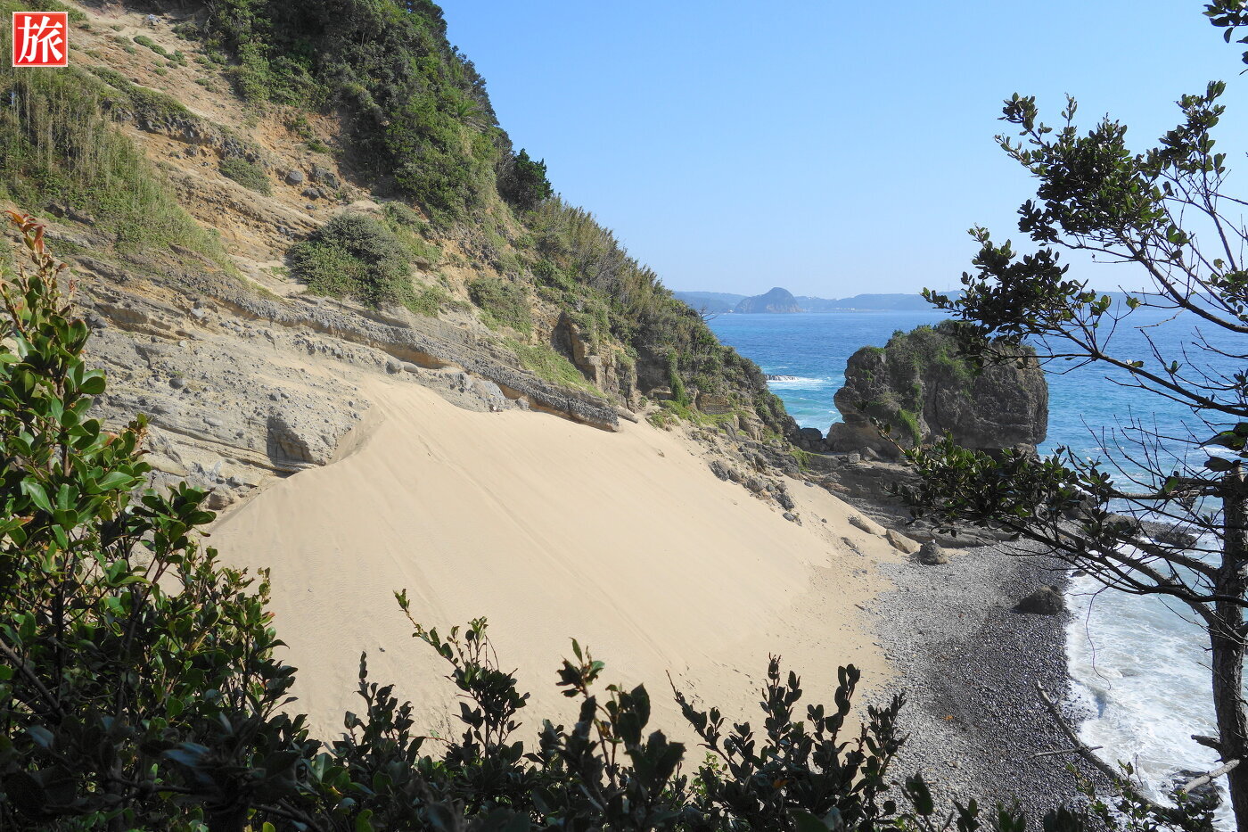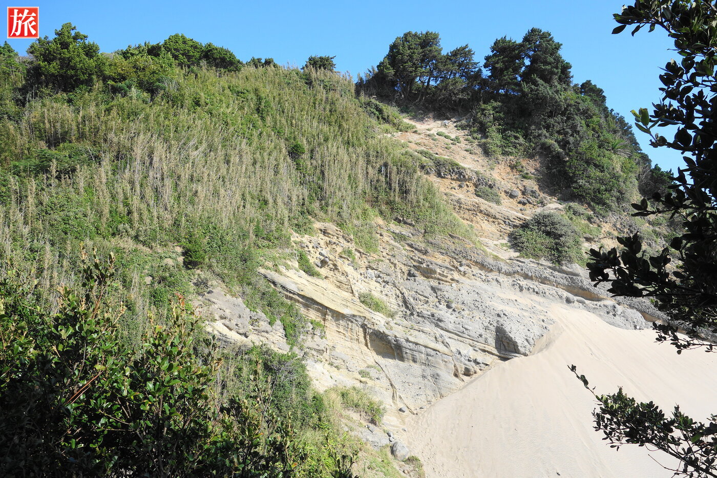 洞窟の岬の横には美しい白浜のビーチと、白砂が吹き上がってできた天然のサンドスキー場がある。