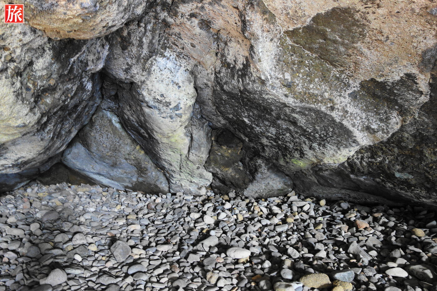 大地が作った神秘のハートの説明「ハート型に見える龍宮窟は恋人たちの人気スポット」。神秘のハート。小石が混ざり合った珍しい洞窟の地層。