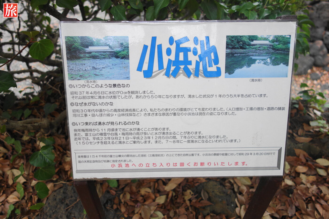 自然湧水する小浜池は渇水していました。小浜池の説明板。渇水した状況が1年の内大半を占めているそうです。冬期の富士山上部の積雪が多いと次の年の夏期に湧水量が多く、小浜池の水位も高くなるようです。渇水した小浜池と楽寿館。