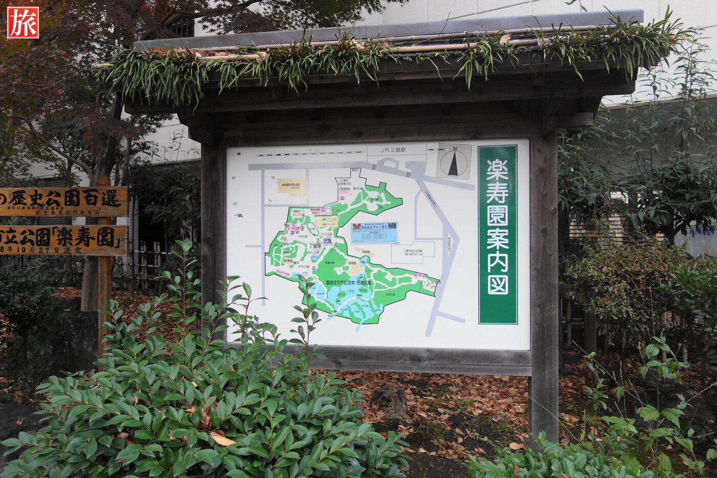 正門付近。楽寿園案内図。日本の歴史公園100選にも選ばれています。