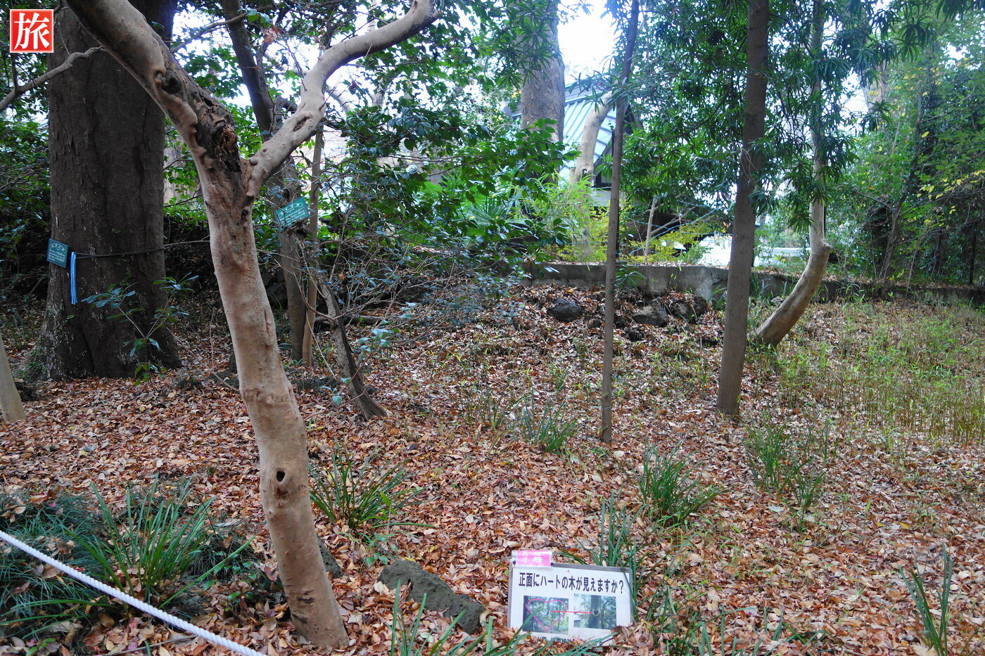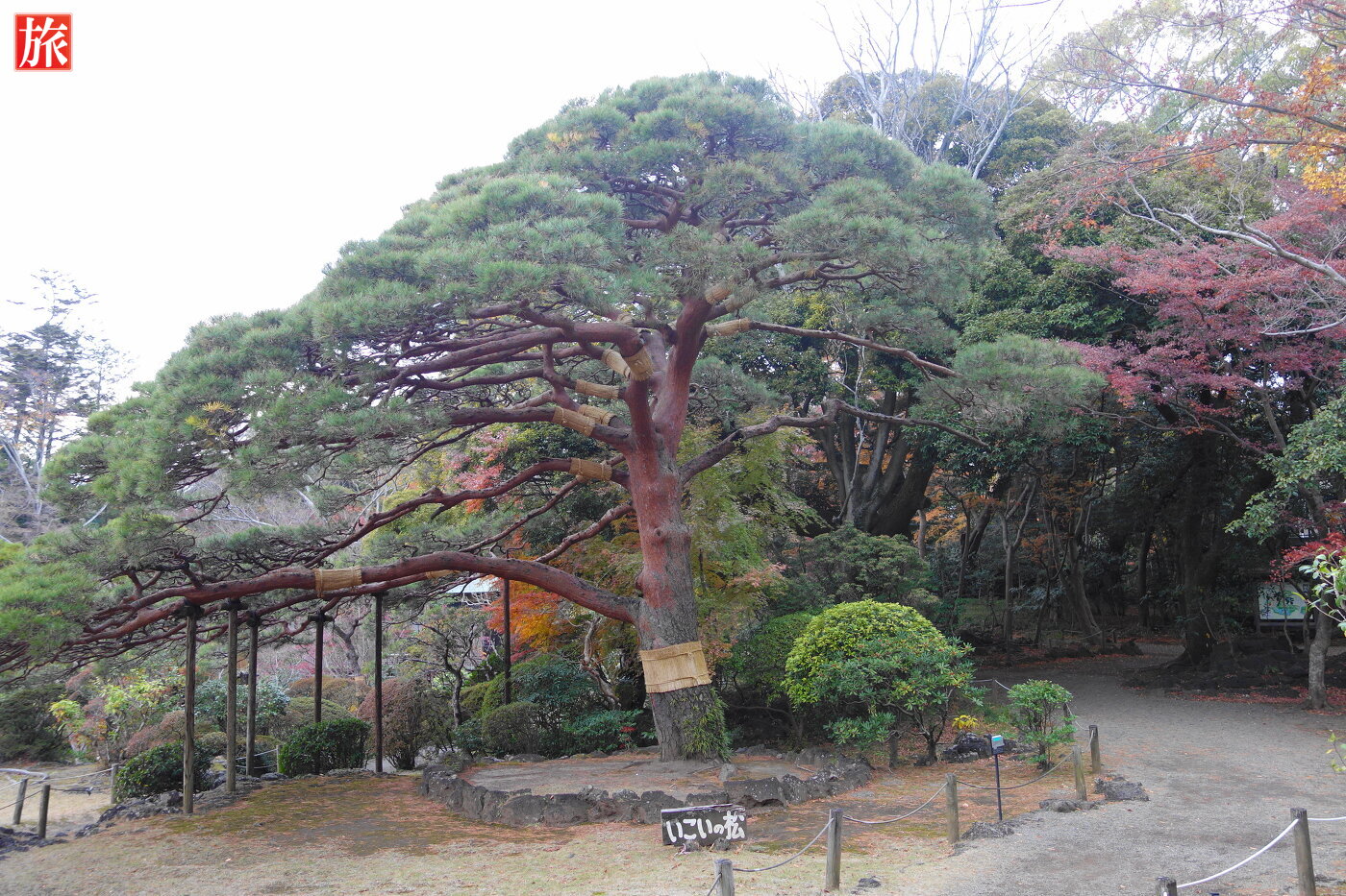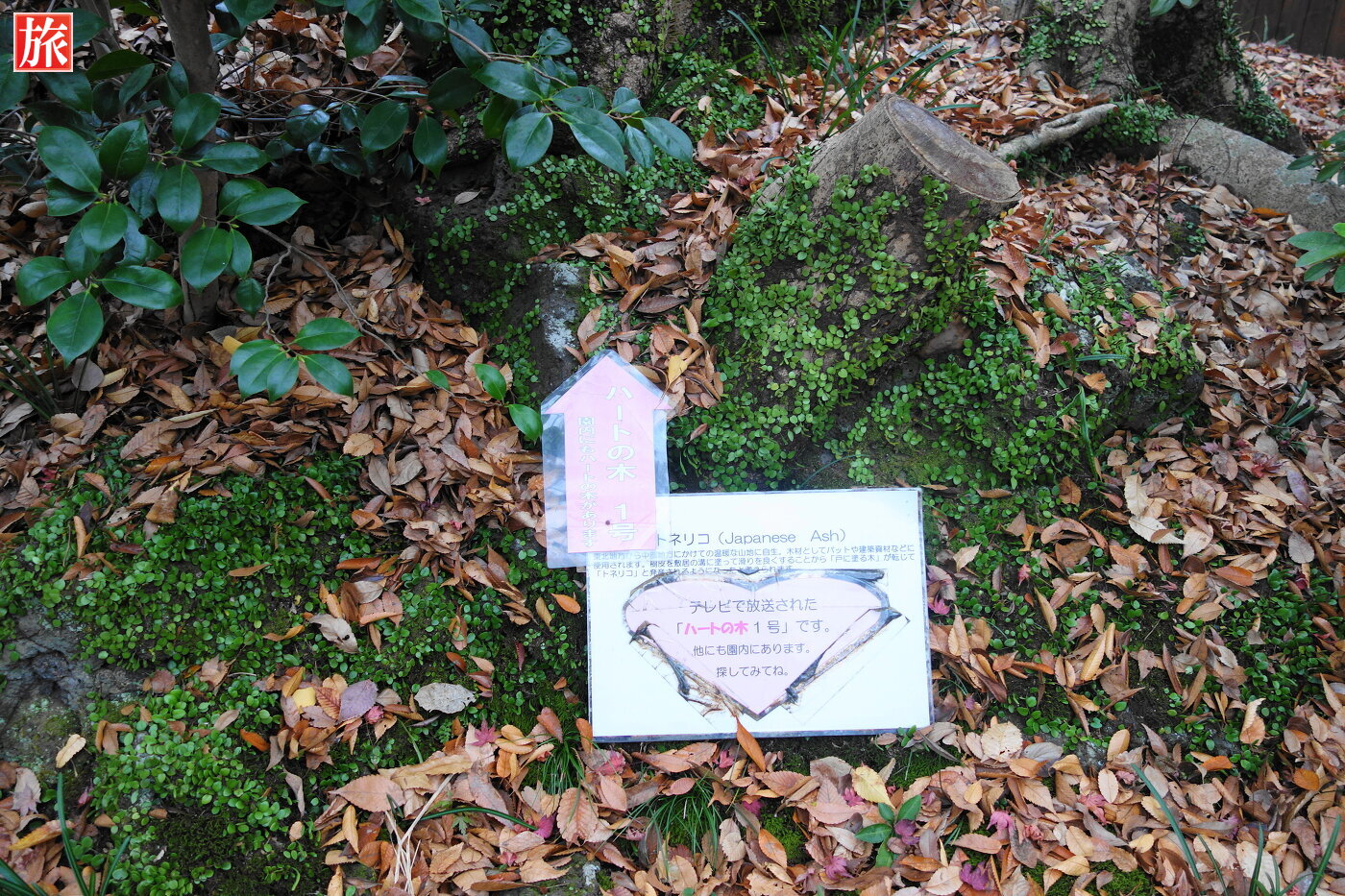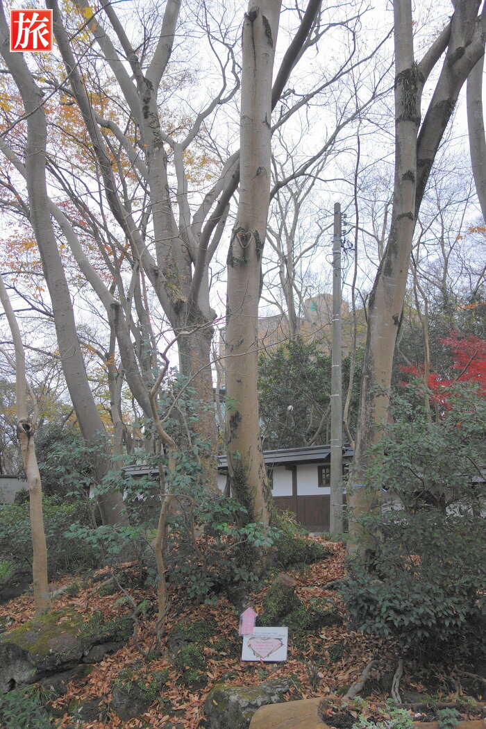 正門を入り「はぎの森」にハートの木4がありました。園内には他に4本、正門前に元祖ハートの木があります。樹齢約350年のアカマツ「いこいの松」。
