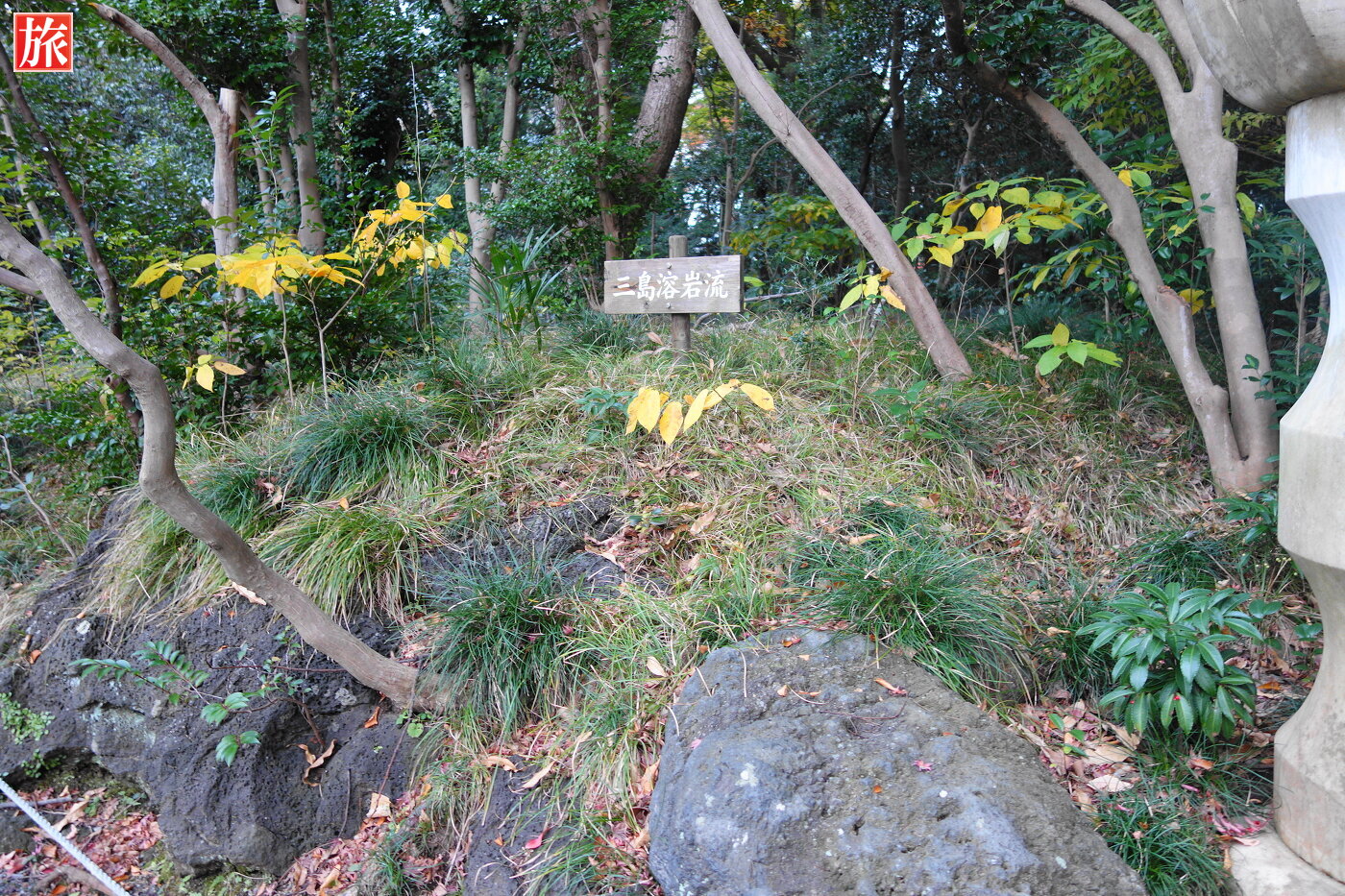 入園料は大人(15歳以上)1人300円です。森に囲まれた自然豊かな公園です。楽寿園の地形をつくる三島溶岩流。