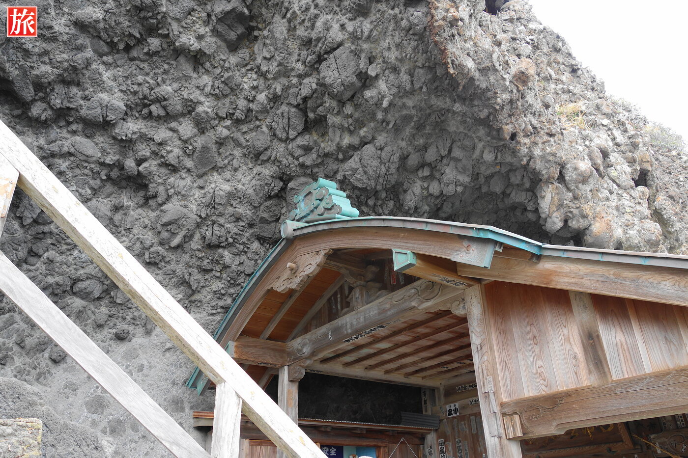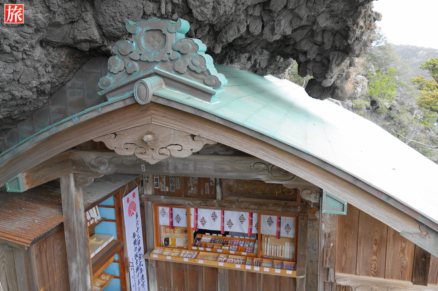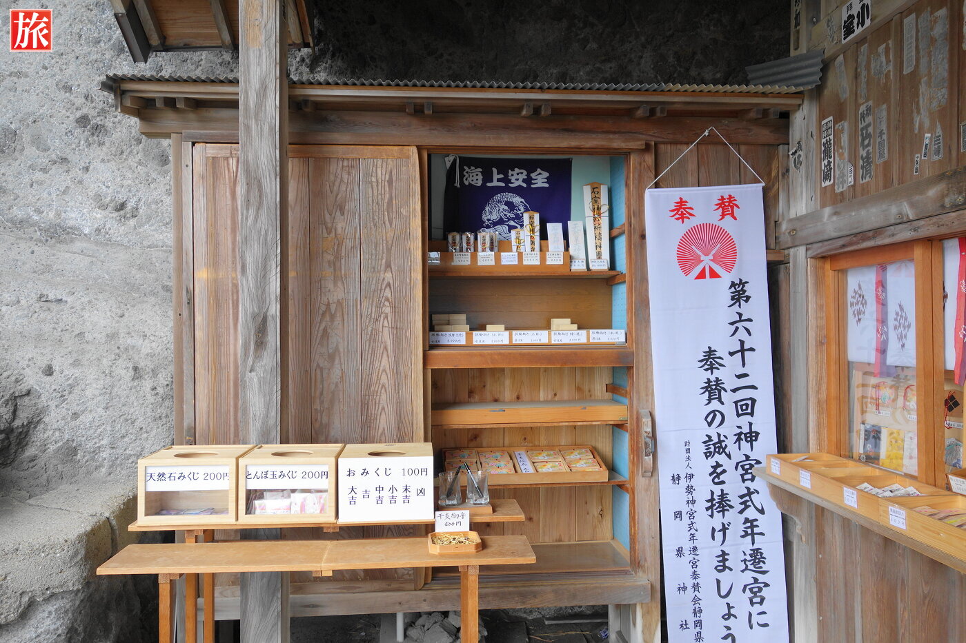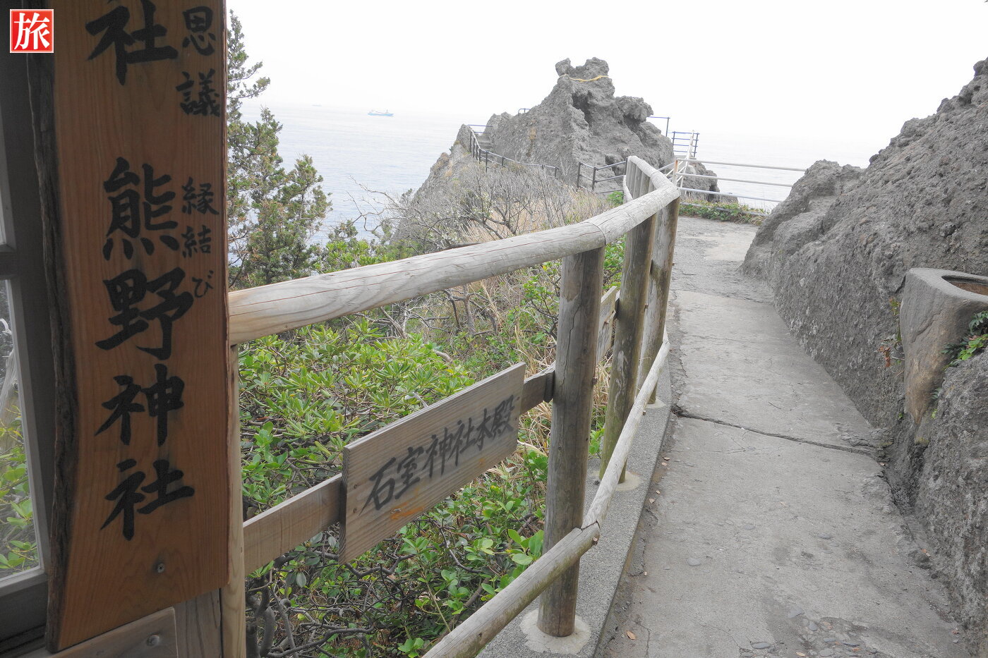 観光ルート 石廊崎レポートTOP > 石廊埼灯台 > 石室神社 > 石廊崎 熊野神社切り立った断崖絶壁の小さなくぼみにある神社です。海上安全や縁結び・商売繁盛・交通安全・厄除けの神様が祀られています。社殿が千石船の帆柱を枕に建てられていることから。伊豆七不思議のひとつで「石廊崎権現の帆柱」の江戸時代から伝わる伝説の舞台でもあります。5世紀ごろ石室山金剛院として建立されたのが始まりだといわれる古い神社。
