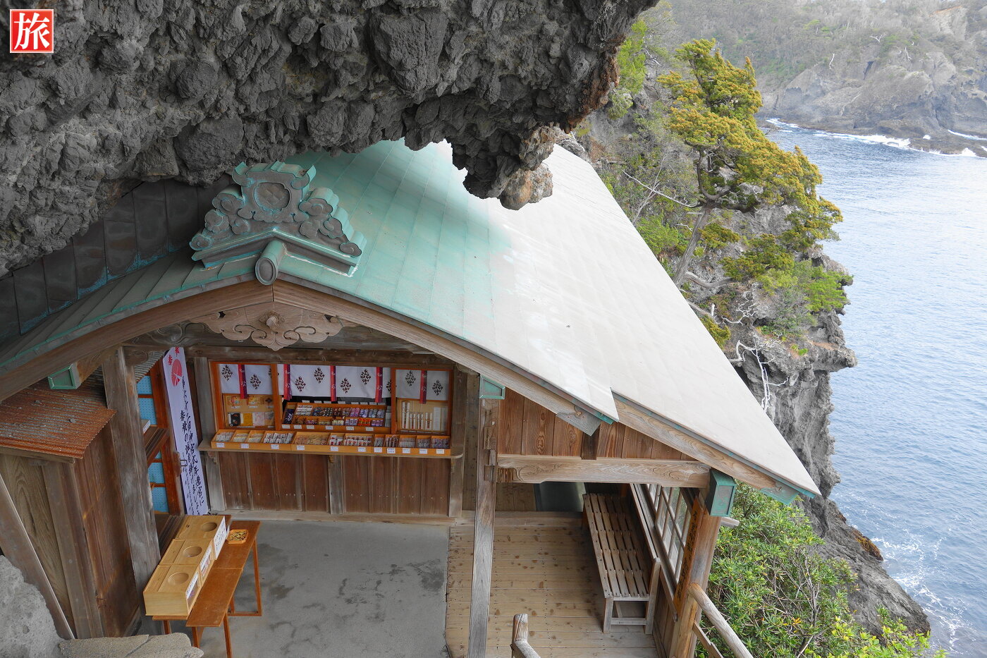 石廊崎の最南端、断崖のくぼみに危うげに立つほこら。海の安全を守る神社らしく千石船の帆柱が床を支えている。