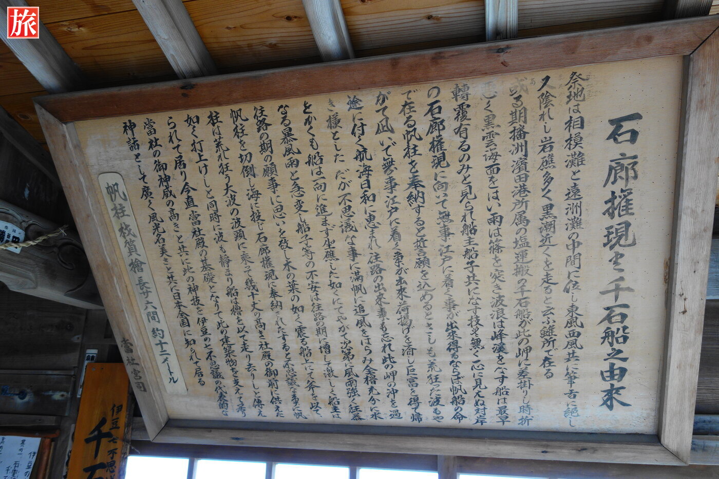 祭地は相模灘と遠州灘の中間に位し東風西風共に筆舌に絶し又陰れし岩礁多く黒潮近くを走ると云う難所で在る或る期播州濱田港所属の塩運搬の千石船が此の岬に差掛りし時、折悪く黒雲海面をはい雨は篠を突き波浪は峰渓をなす船は最早転覆有るのみと見られ船主子共になす技も無く一心に見えぬ対岸の石廊権現に向いて無事江戸に着く事が出来得るならば帆船の命で在る帆柱を奉納すると誓願を込めるとさしも荒狂った波もやがて凪いで無事江戸に着く事が出来荷揚げを済し巨富を得て帰途に付く航海日和に恵まれ往路の出来事も忘れ此の岬の沖を過ぎ様としただが不思議な事に満帆に追風をはらみ全櫓充分に水をかくも船は一向に進まず坐礁した 如くにてやがて次第に風雨強く狂暴なる暴風雨と急変し船子等の不安は往路の期に増して激しく船主は往路の期の願事に思いを致し木の葉の如く震る船上にて斧を以て、帆柱を切倒し海に投じ石廊権現に奉納されたすると不思議な事に帆柱は荒れ狂う大波の波頭に乗って幾十丈の高き社殿の御前に供えた如く打上けしと同時に波も静まり船は櫓を以て走り去りしと傳えられて居り今直當社殿の基礎となりて此の建築物を支えて居り當社の御神威の高きと共に此の神技を伊豆の七不思議の代表的な神話として廣く風光名美さと共に日本全国に知られて居る
