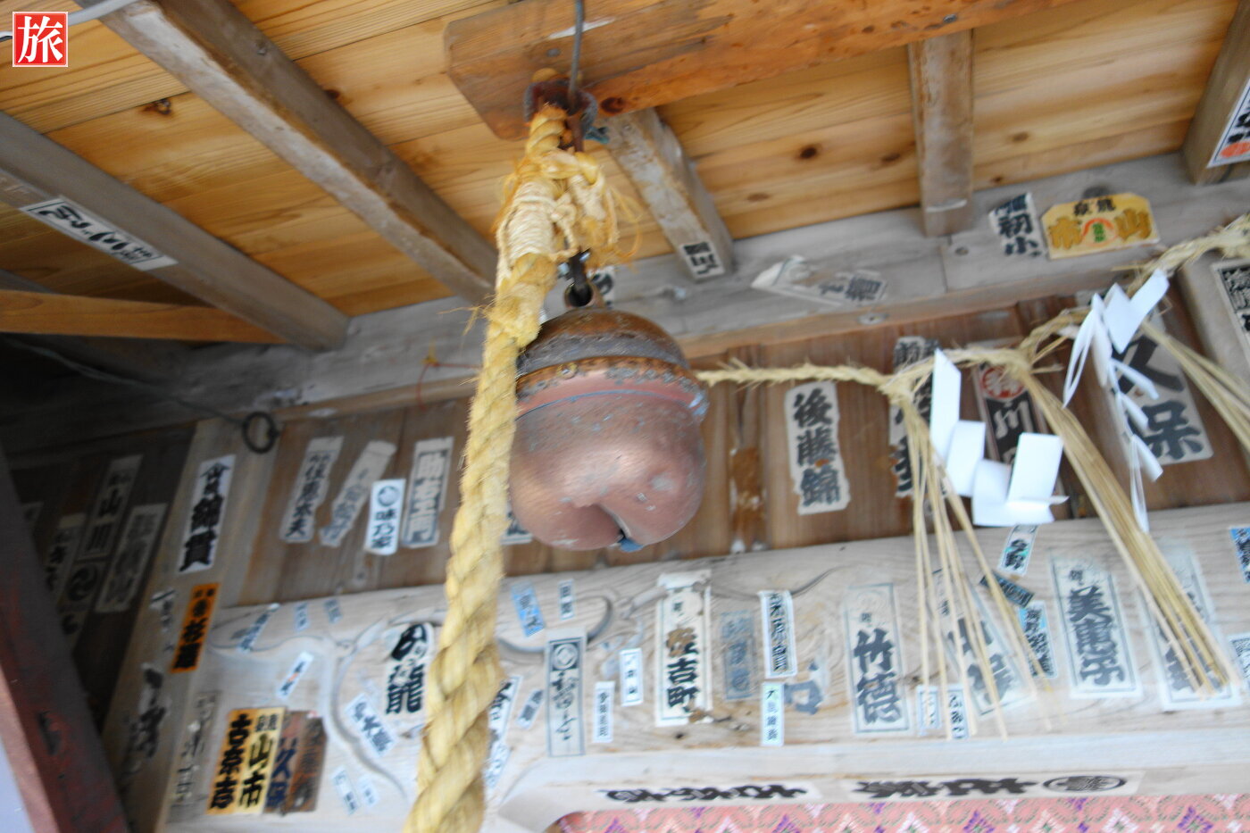 柱に立掛けられた板には縁結び熊野神社・石室神社本殿と書かれています。役行者、前鬼・後鬼他の木造が祀られています。本殿の様子、大きな鈴。