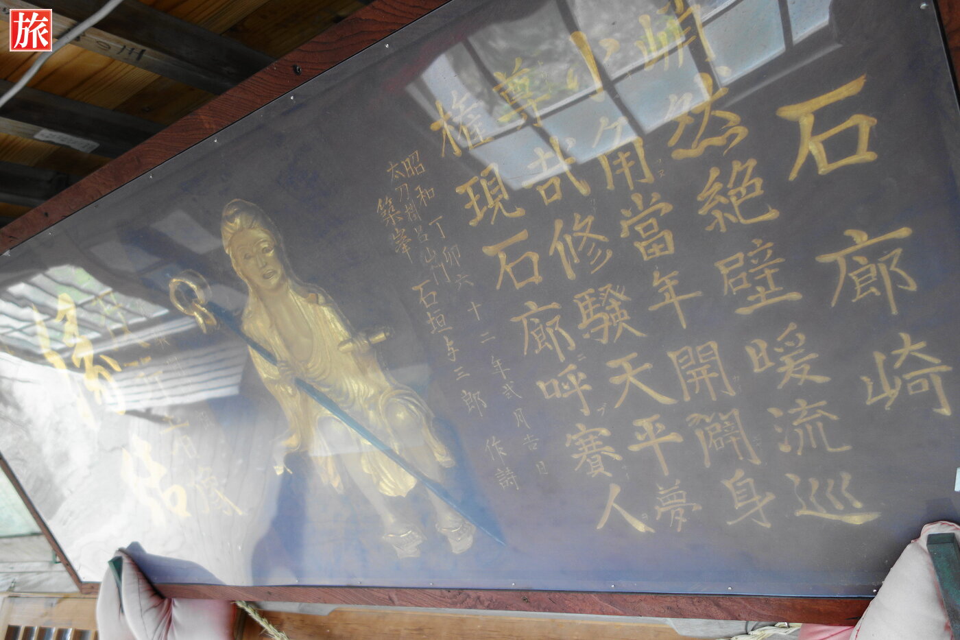 こんなすごい所に作ったもんですね!断崖絶壁に屋根が埋め込まれています。入口付近にあった紀元2千6百年記念と書かれた石碑。