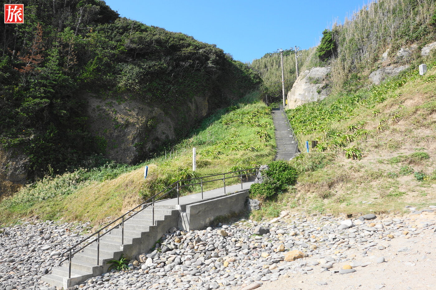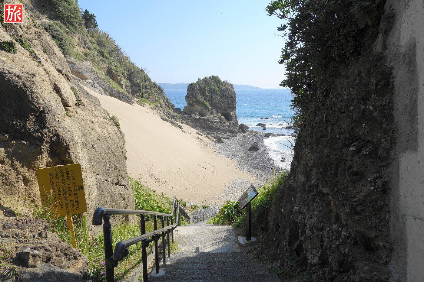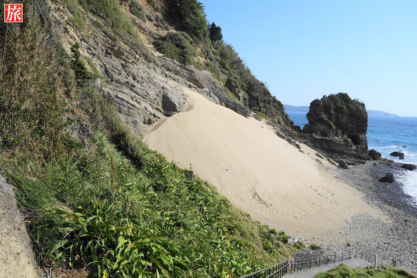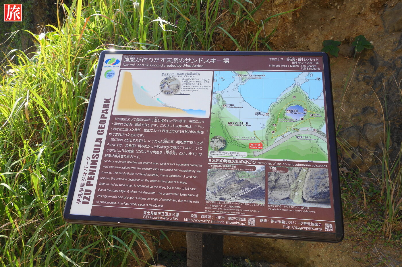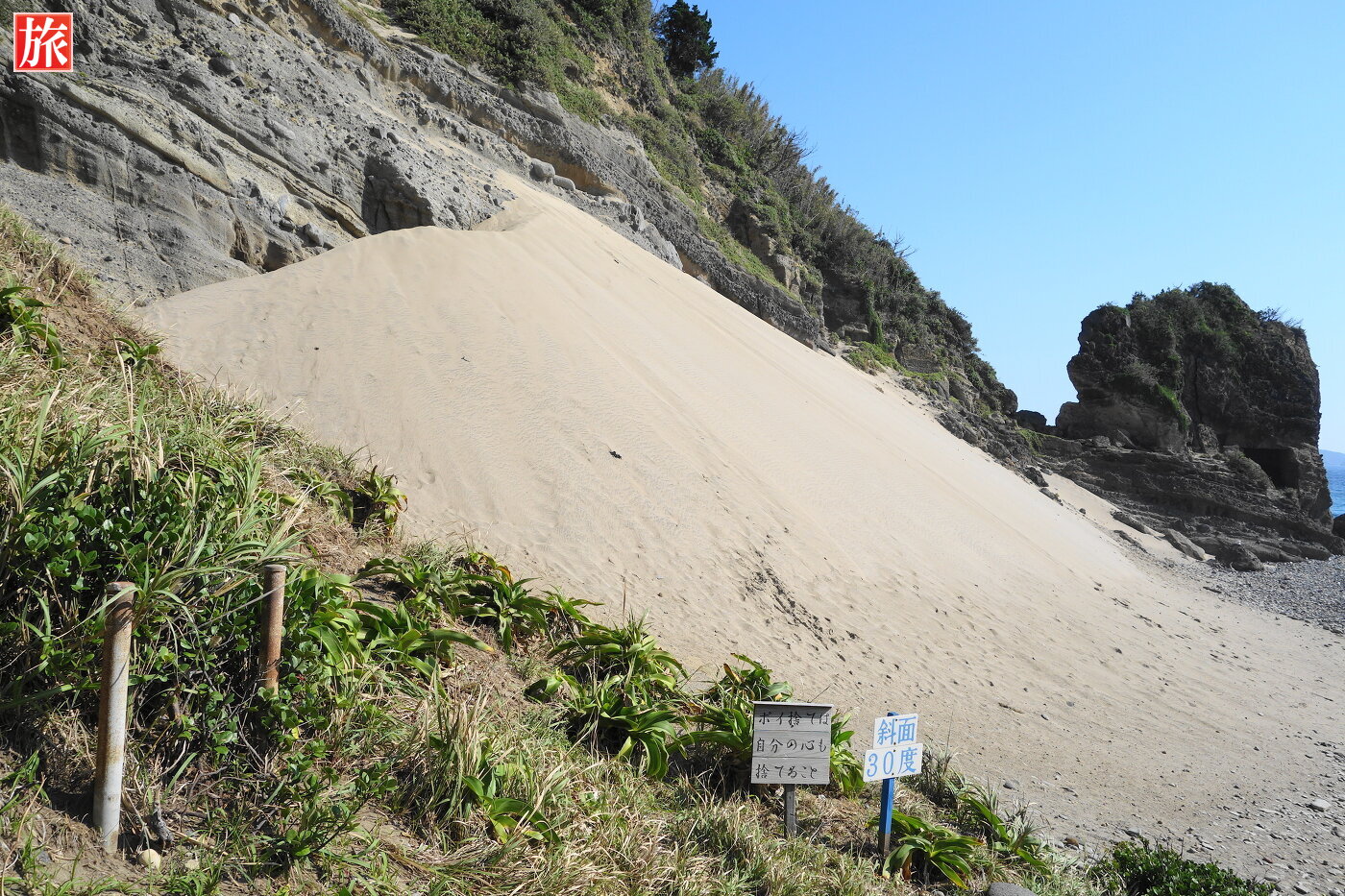 道路脇の細い階段を下っていきます。田牛サンドスキー場の説明。案内の抜粋「風に吹き上げられた砂は、いったんは崖の高い場所まで持ち上げられますが、急角度に積みあがった砂はやがて崩れてしまい、いつでも同じような角度(このような角度を安息角といいます)の斜面が維持されるのです」