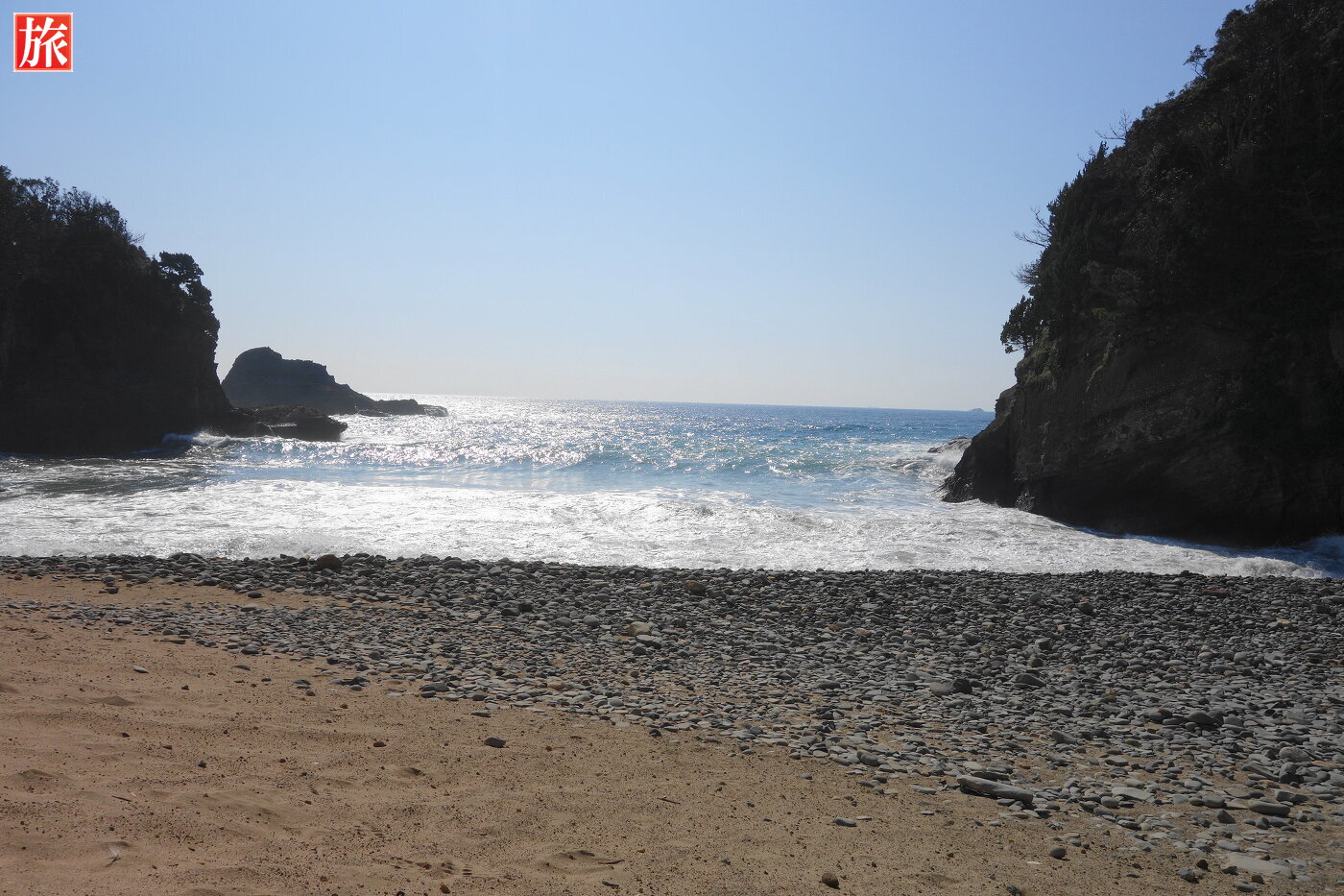 石丁場跡方向の風景。正面の海、浪打際は小石がゴロゴロしています。横から眺めてみると・・こんな感じです。