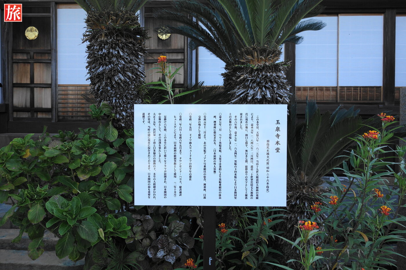 幕末期にアメリカの総領事館として使用され、日本開国の中心舞台となった玉泉寺へ立ち寄ってみました。「玉泉寺」は、安政元年にアメリカと下田追加条約を結んだ際に、アメリカ側の休憩所となり、日露和親条約締結に向けての日露交渉の場としても使用されたお寺で、その3年後には、アメリカ総領事タウンゼント・ハリスが居住し、総領事館が置かれた開国の歴史を彩る貴重な寺歴があります。