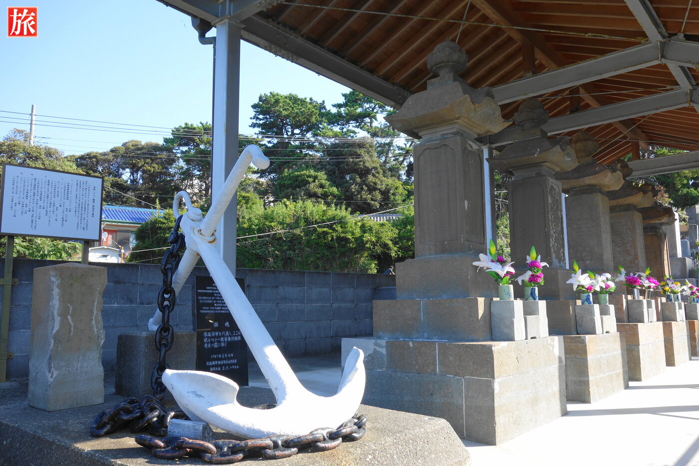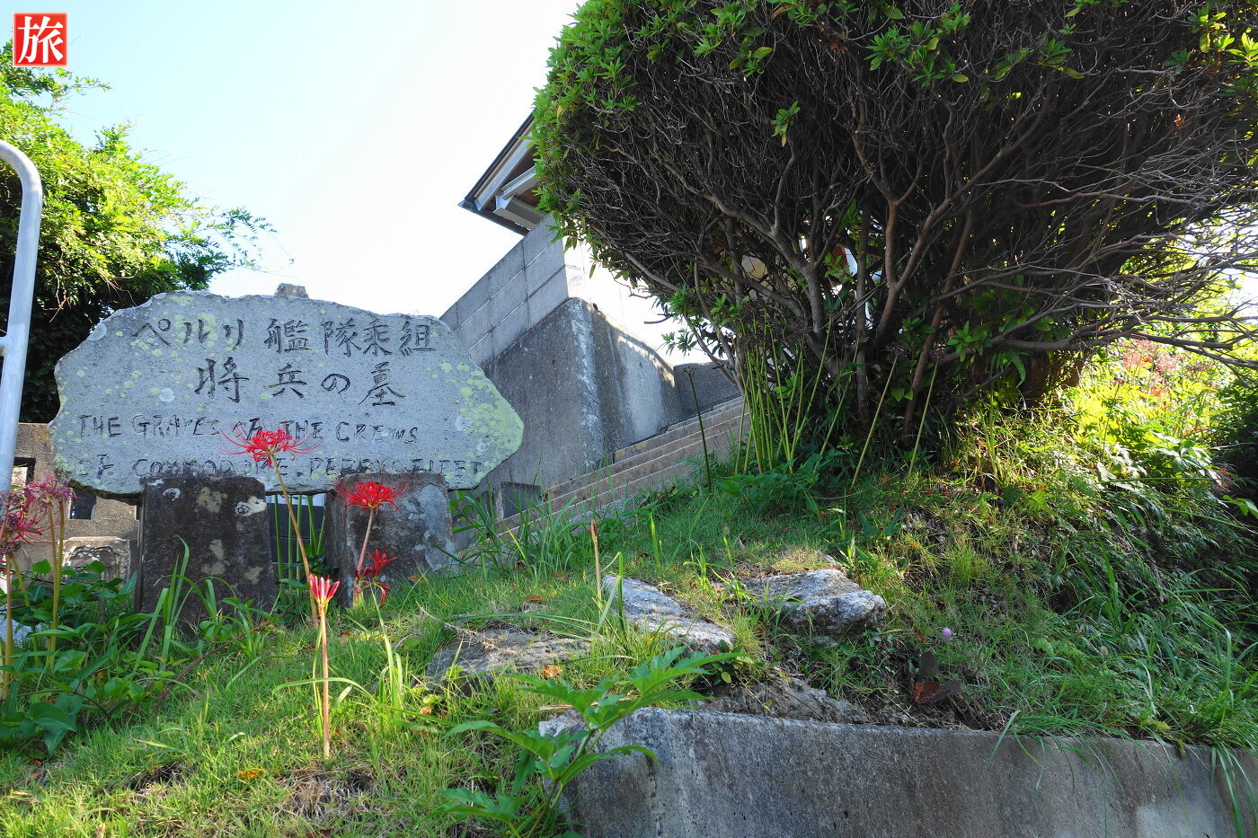 ペルリ艦隊乗組将兵の墓の石碑。日本最初の外国人墓地、黒船(ペリー艦隊)の乗員5名の墓。本堂の横にハリスが、「ストーブの煙突を出した石」が埋め込まれていました。