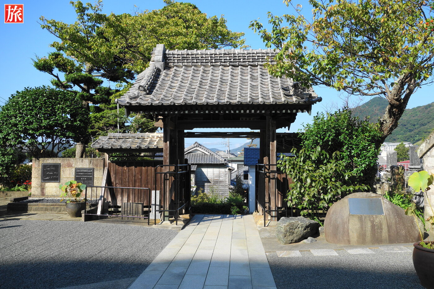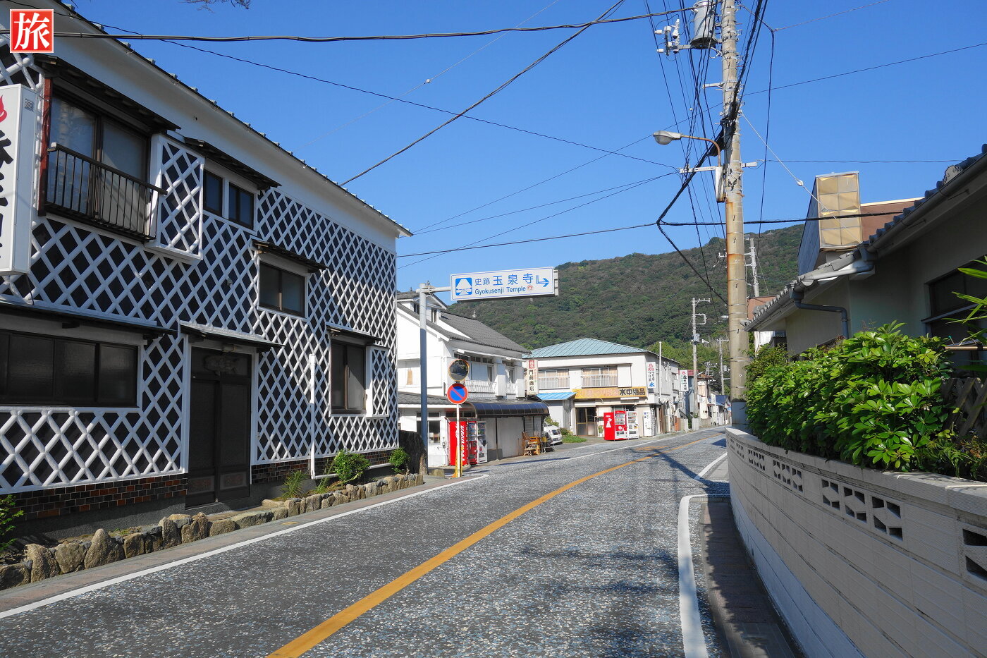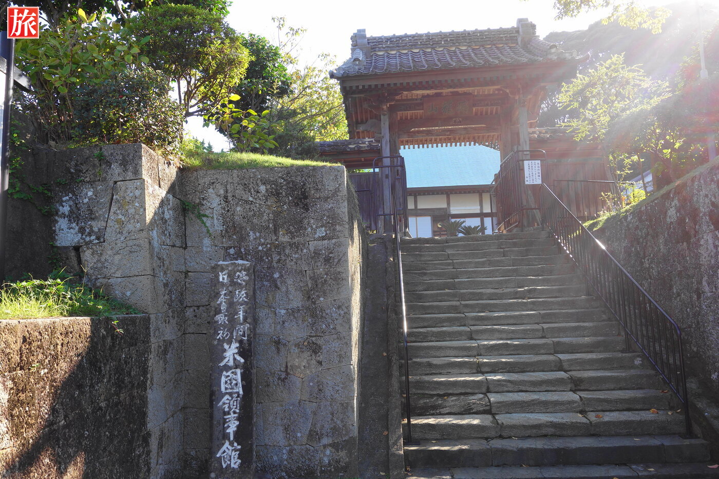 国指定史跡「玉泉寺」付近の道路。階段を上り山門を潜ります。玉泉寺の案内板。