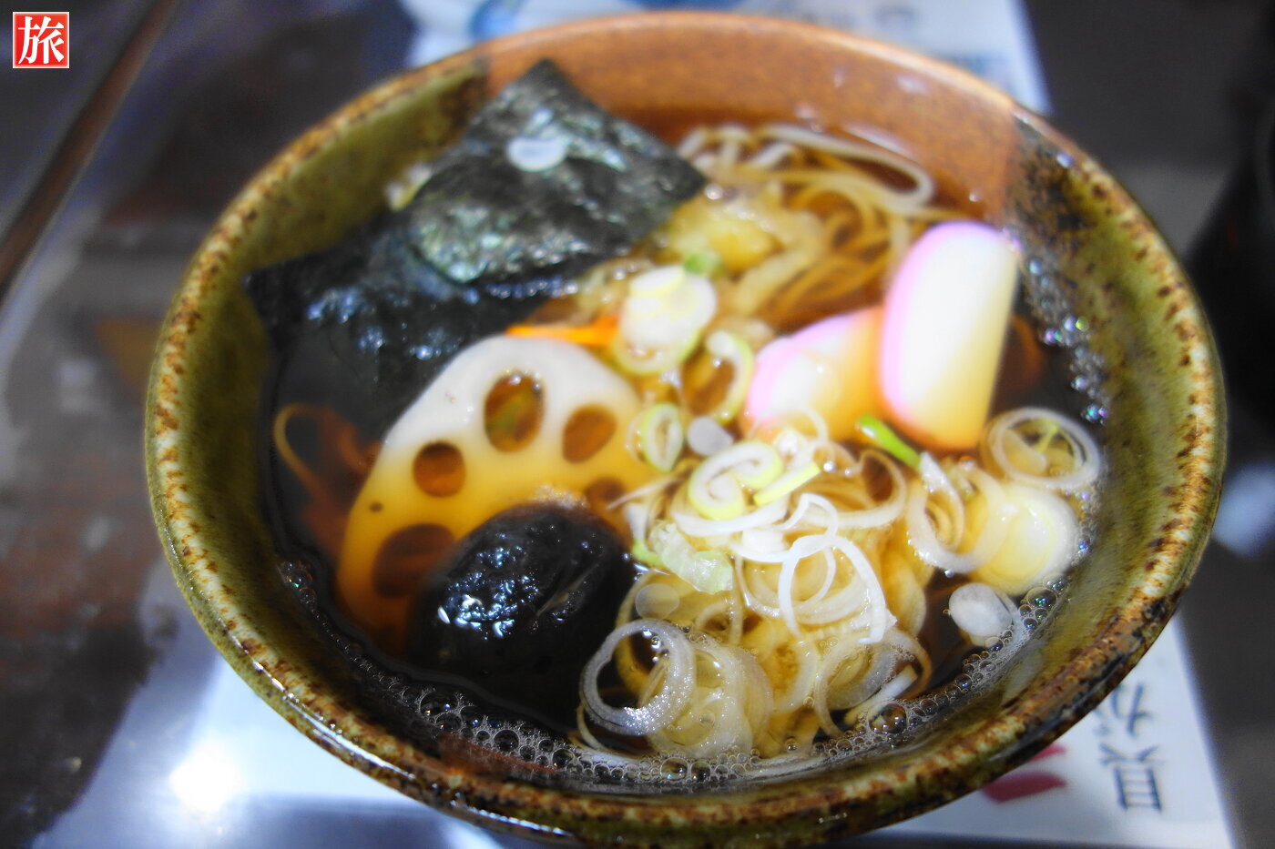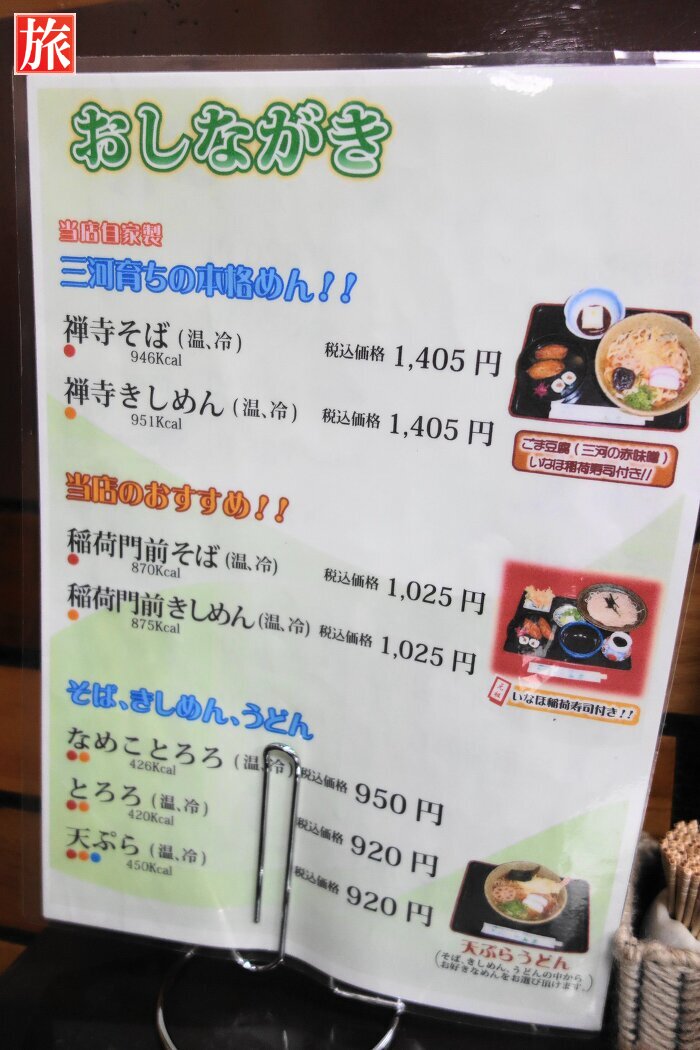 おしながき。いなり寿し。そば・きしめん、味はかなり薄口に感じました。邪道かもしれませんが多めに七味を足しいただきました。
