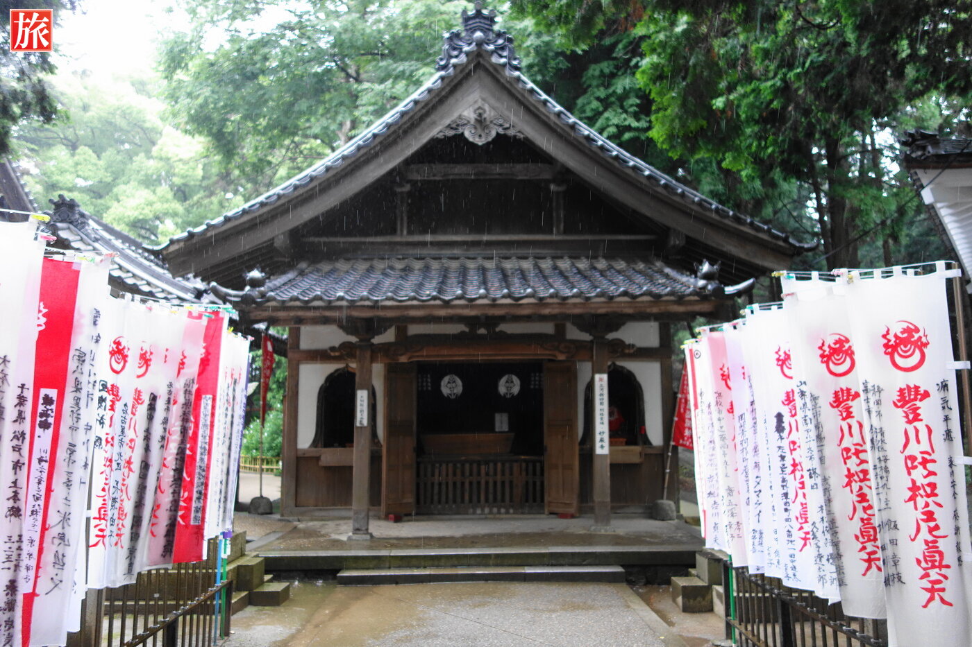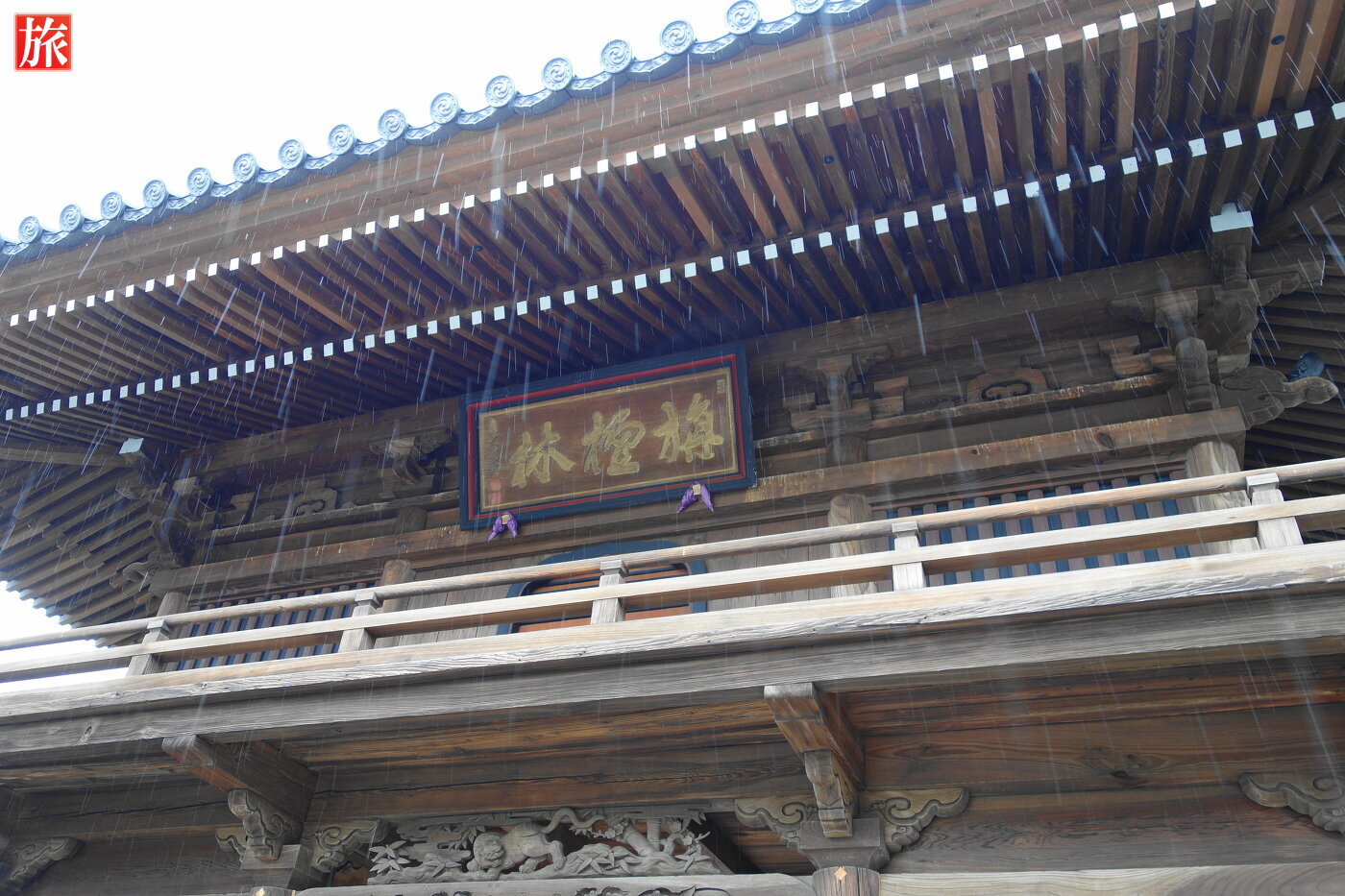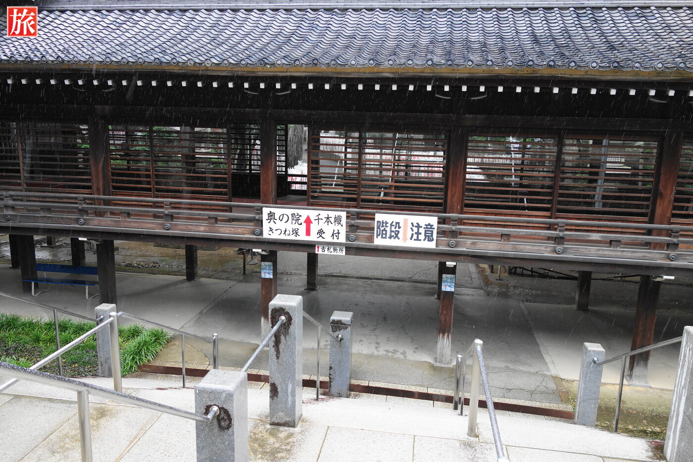 本殿と宝雲殿を繋ぐ渡り廊下。宝雲殿から法堂に繋がる廊下。ここを潜って霊狐塚・奥の院へ向かいます。階段を降りた付近から本堂を振り返ってみた様子。雨足が強い〜・・・