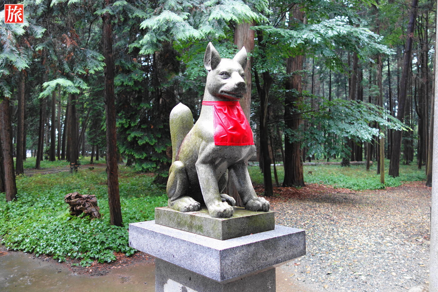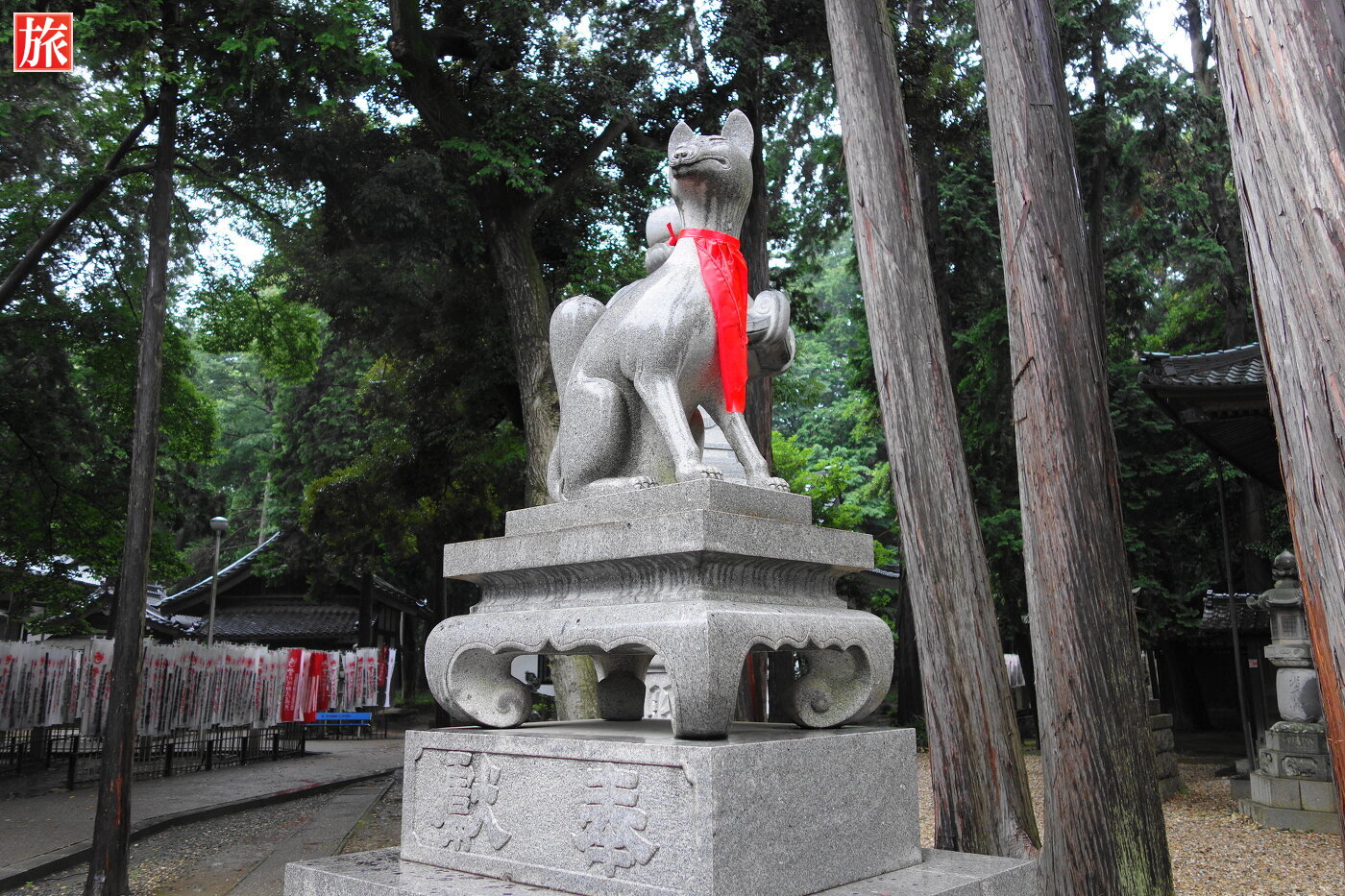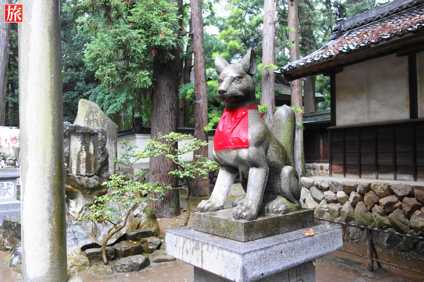 境内の参道にある鳥居。鳥居前に鎮座する狐。寺宝館、現在は休館中。