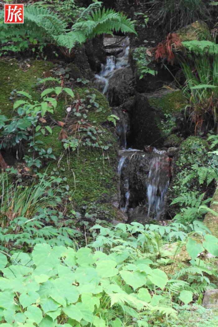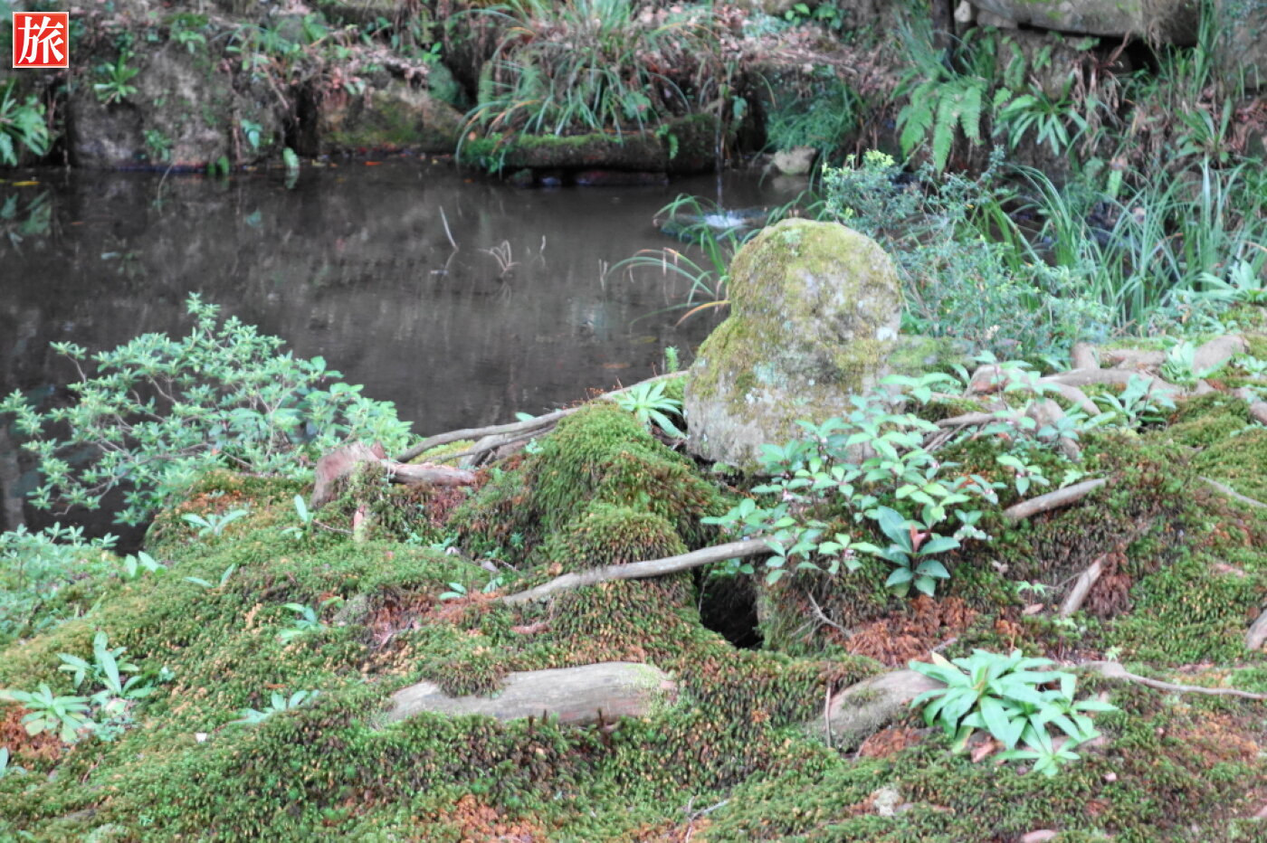 一面青苔に覆われ、瑠璃光庭とも呼ばれます。お地蔵様。池と滝もありました。
