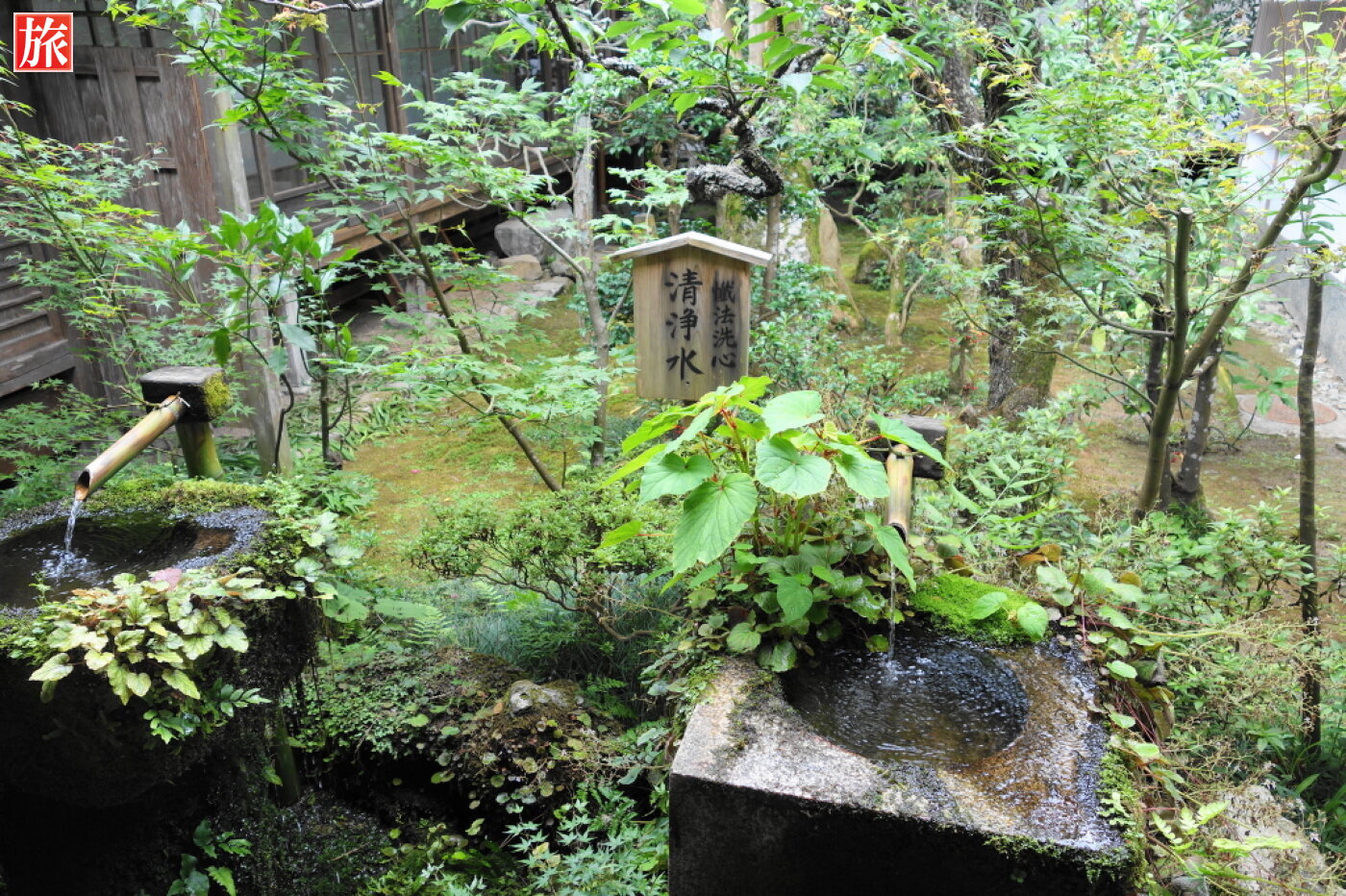 客殿方向から見た風景。手水鉢。宸殿から極楽院を眺めた様子です。