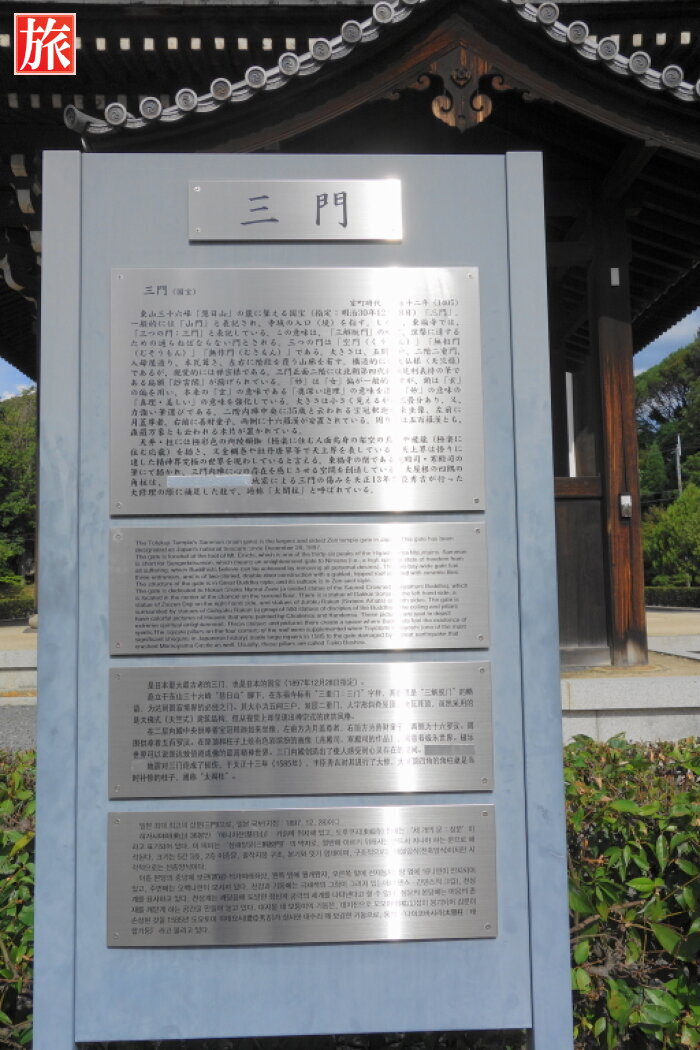 三門(国宝)です。応永32年(1425年)に足利義持が再建し、現存する禅寺の三門としては日本最古のものです。三門の案内板。