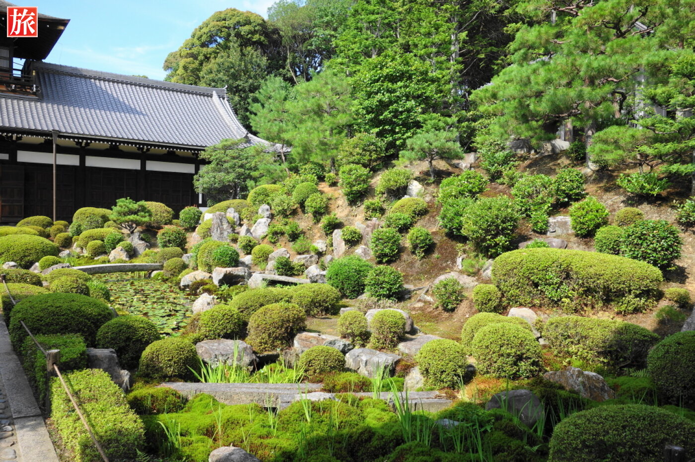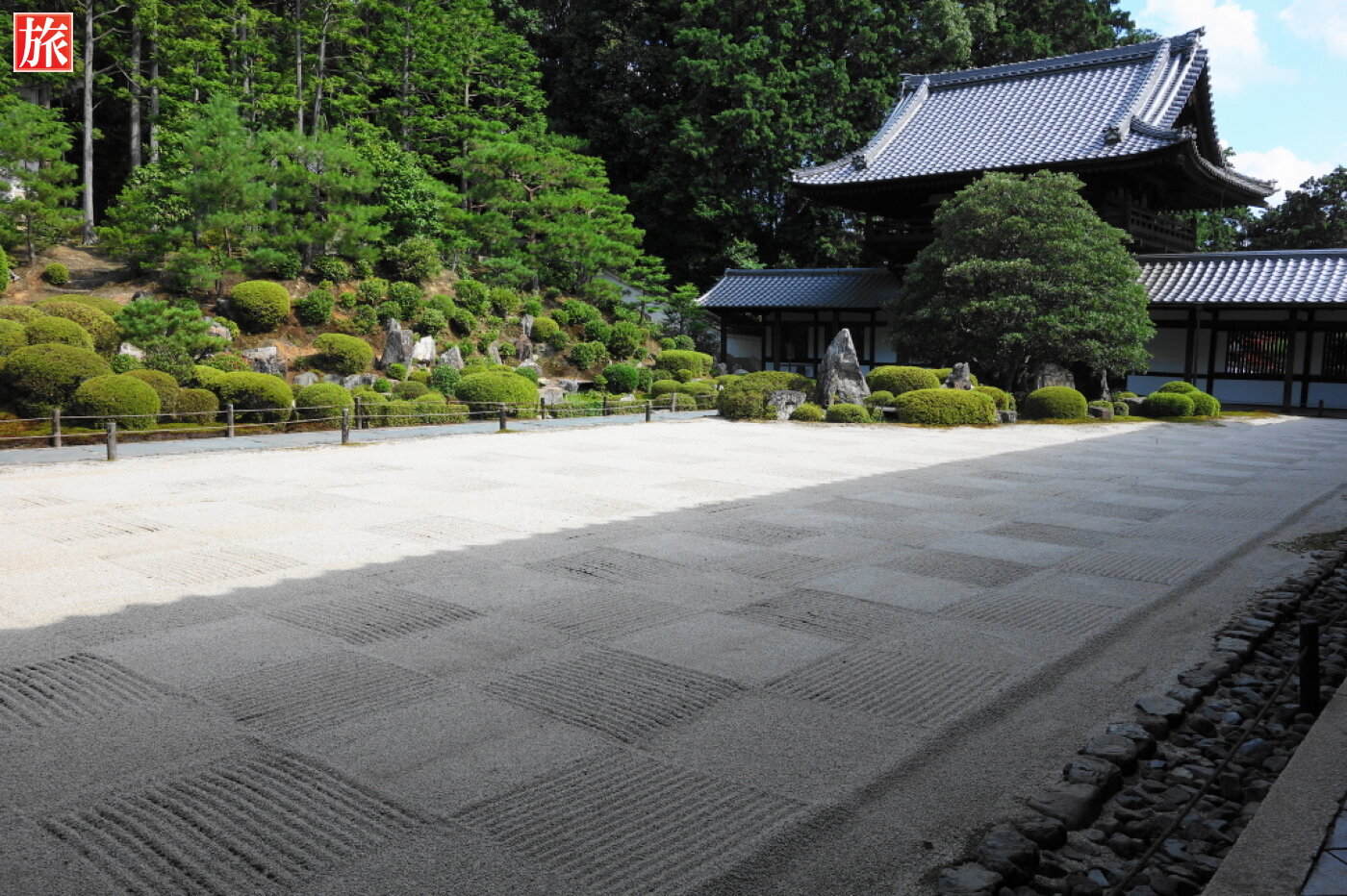 右写真は方丈西庭。西庭は「井田市松」の庭でさつきの刈込みと砂地が大きく市松模様に入り、くず石を方形に組んで井田を意図して表現します。