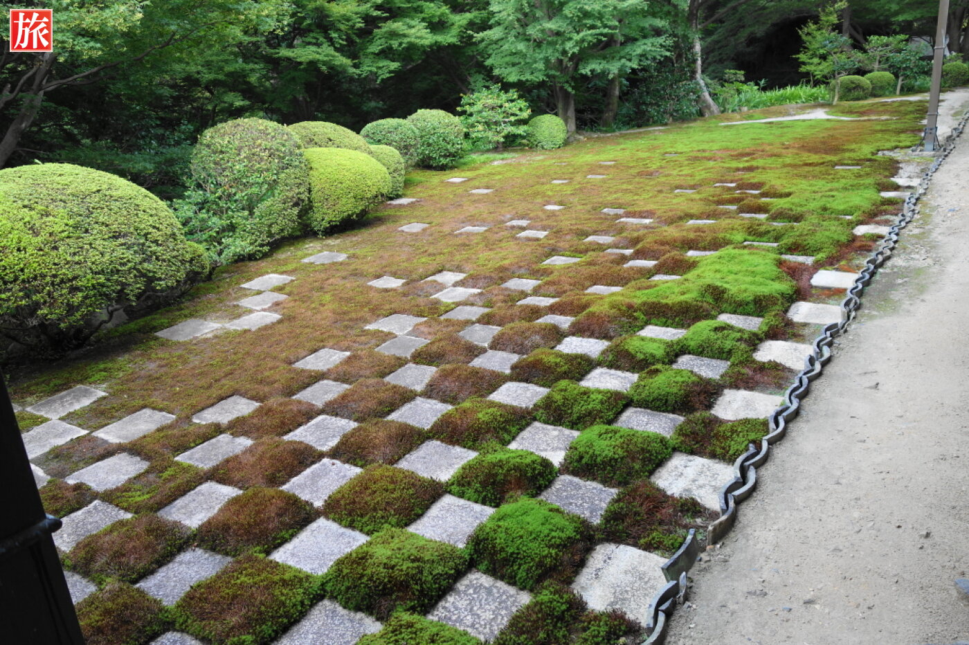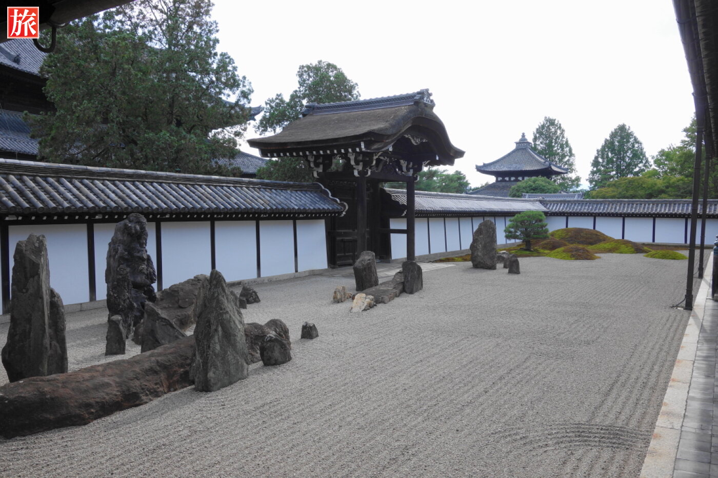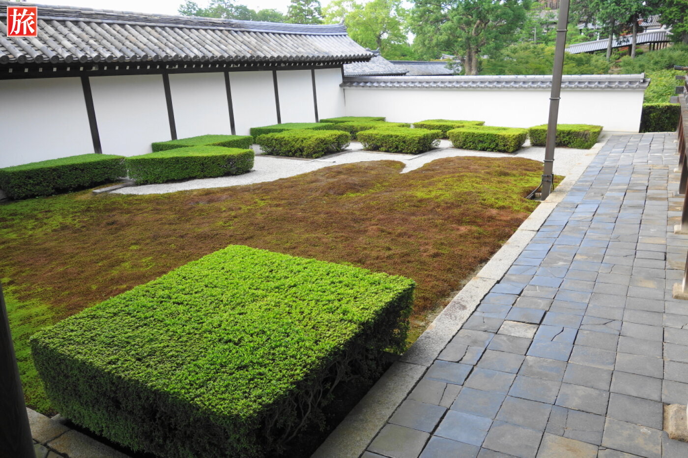 方丈から通天橋を望む。方丈北庭(裏庭)作庭以前に南の御下賜門内に敷かれていた石を利用し、石と苔を幾何学的な市松模様に配しています。方丈東庭の北側。方丈東庭、東司の柱石の余材を利用して北斗七星を構成し、雲文様地割に配している小宇宙空間
