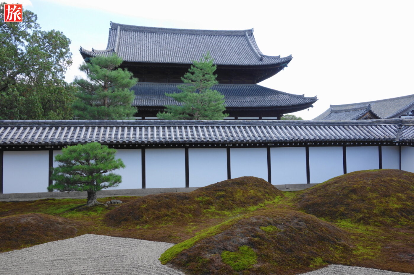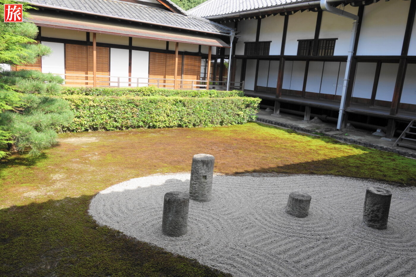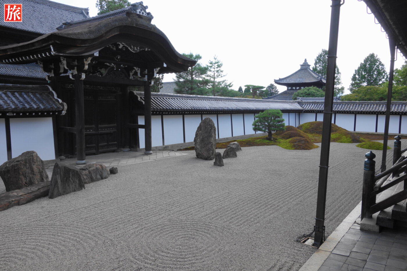 方丈から通天橋を望む。方丈北庭(裏庭)作庭以前に南の御下賜門内に敷かれていた石を利用し、石と苔を幾何学的な市松模様に配しています。方丈東庭の北側。方丈東庭、東司の柱石の余材を利用して北斗七星を構成し、雲文様地割に配している小宇宙空間