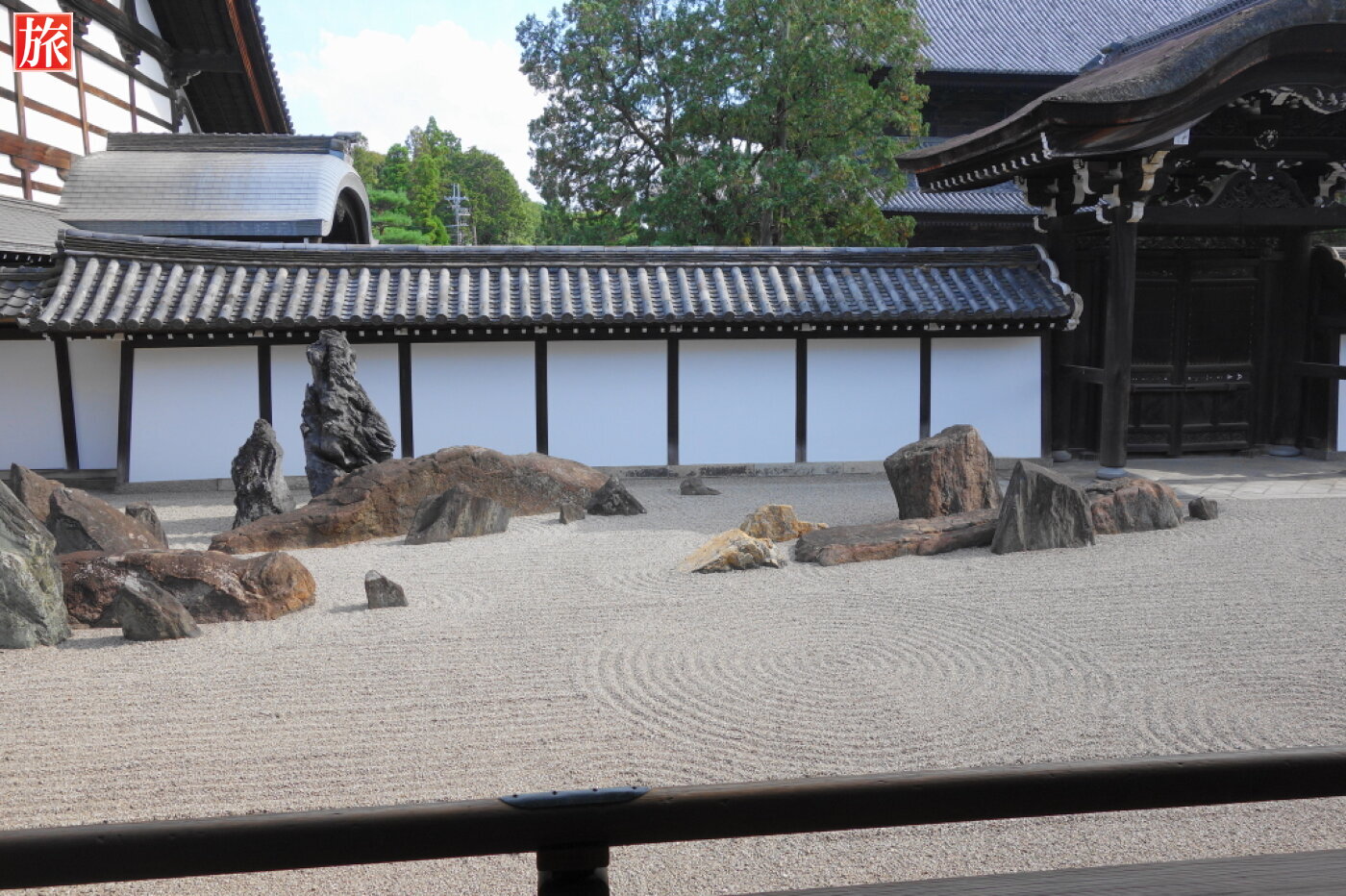 方丈南庭。荒海の砂紋の中に蓬莱、方丈、瀛洲、壺梁の四仙島を表現した配石で、右方には五山が築山として表現されています。