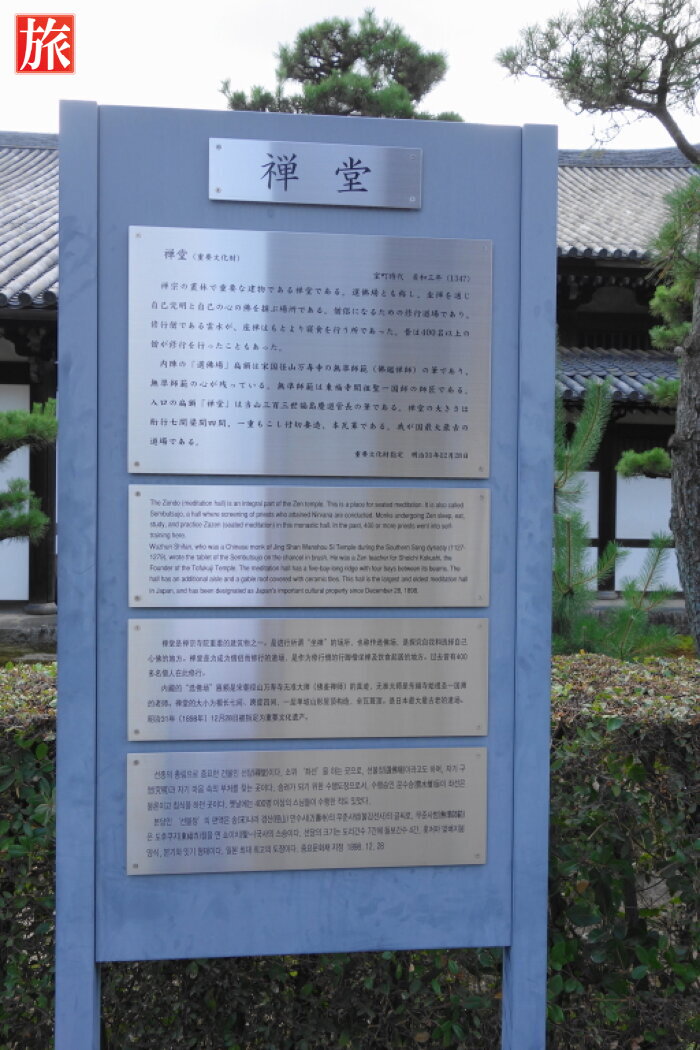 日下門。境内駐車場へもここを通ります。駐車場方向から禅堂(南北朝時代建築の重要文化財建造物)を望む。参禅の道場としては、現存する最古最大の建物です。禅堂入口。禅堂の案内板。