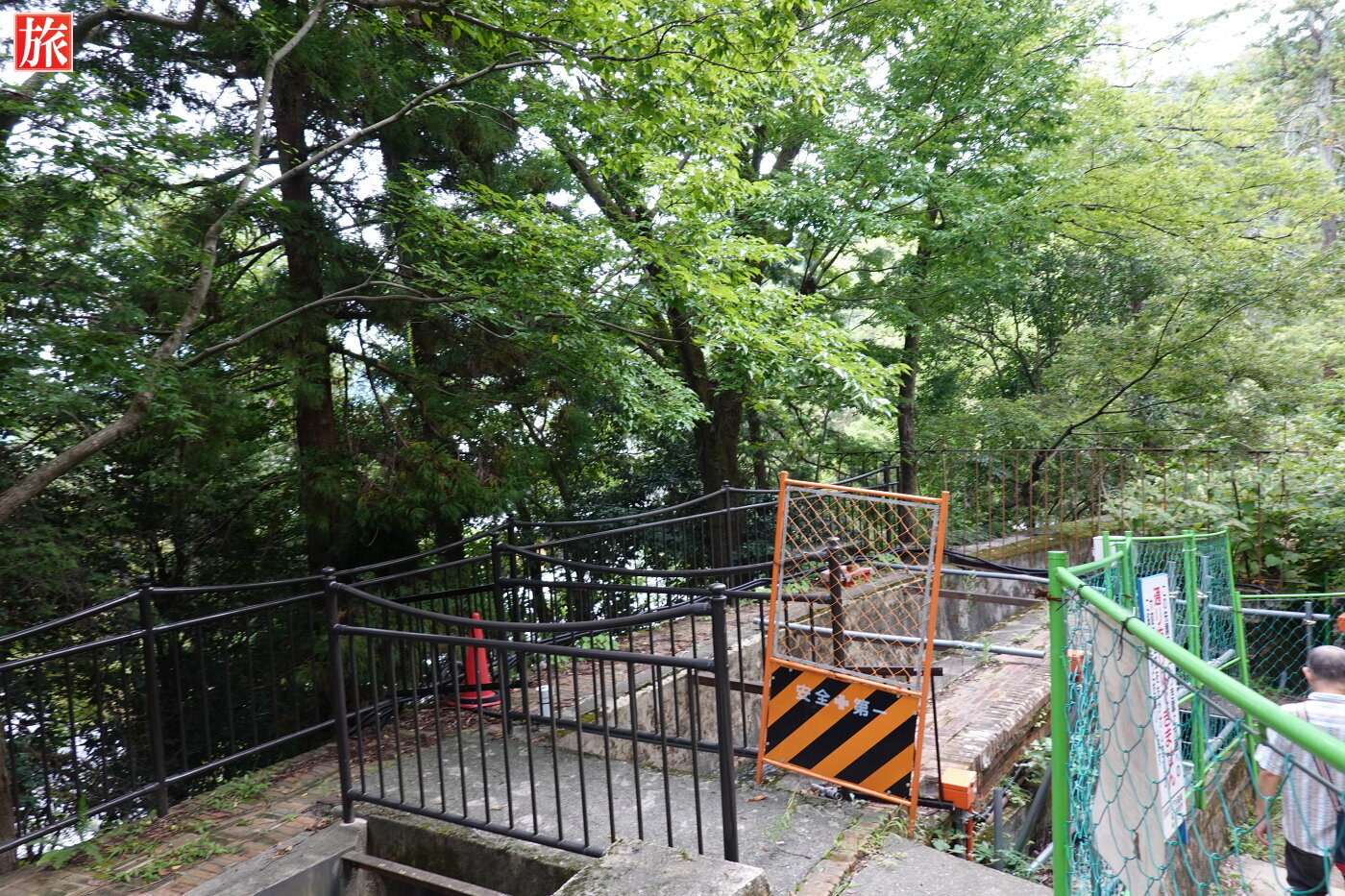 水路を見に階段を上がるも・・工事中。橋の上の水路には湖水が流れています。
