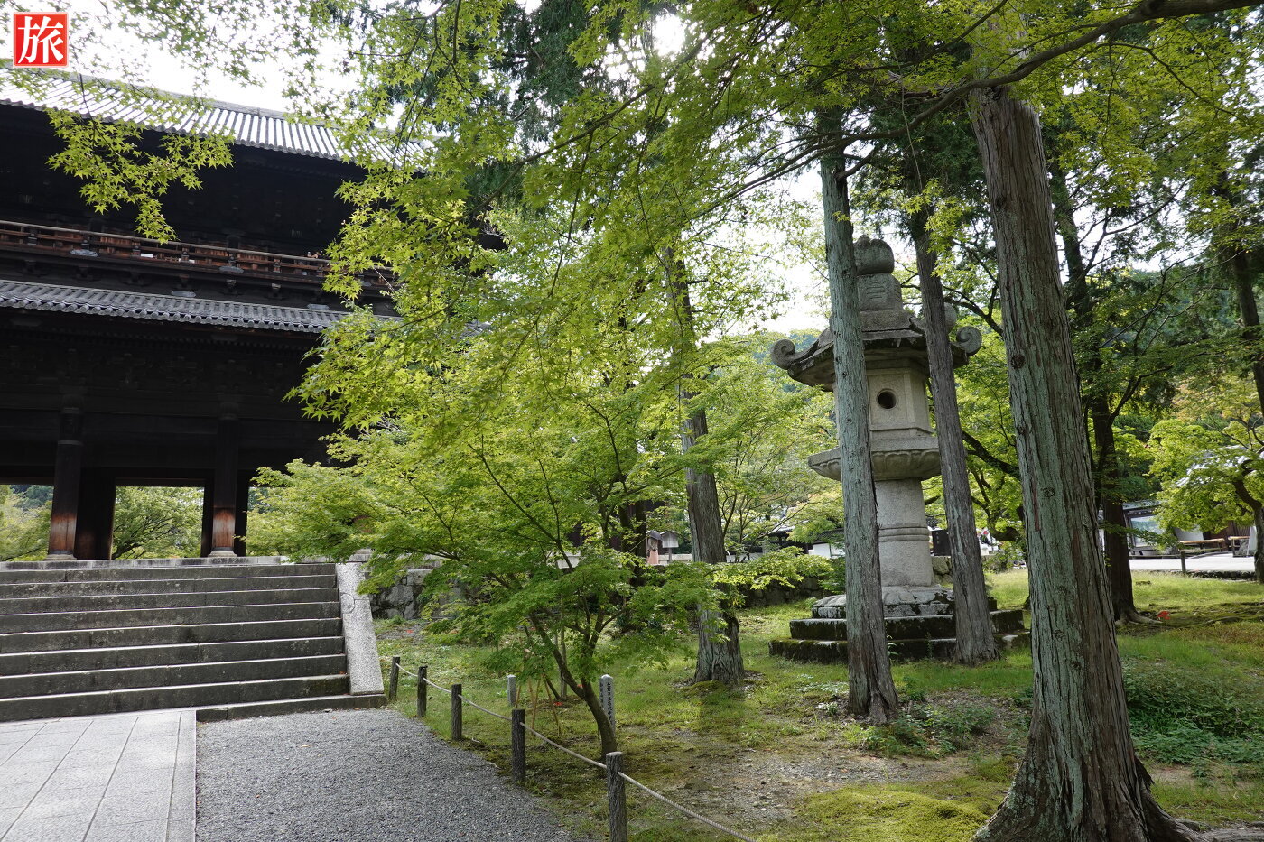 三門に登った五右衛門が「絶景かな、絶景かな・・」と見栄を切る歌舞伎「楼門五三桐(ろうもんごさんのきり)」の場面の場所で知られています。大きい石灯籠(戦国武将の佐久間勝之が寄進者で日本三大灯籠の1つ)高さ約6m。門柱の下から法堂方向を望む