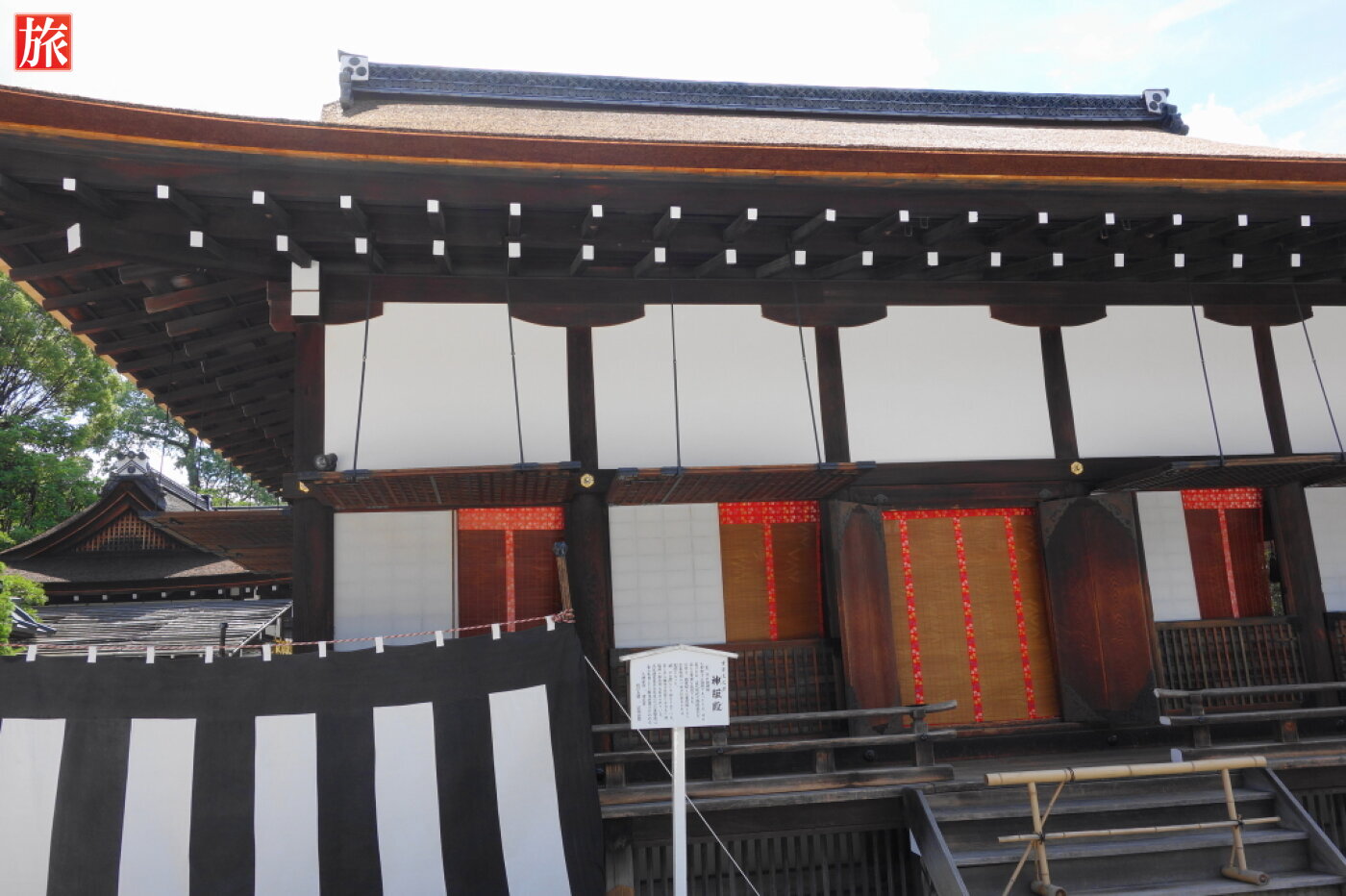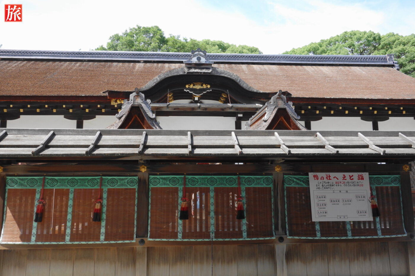 「舞殿」(葵祭の時天皇の勅使が御祭文を奏上され東游が奉納される場所です)。「神服殿」、古来殿内の一室が行幸の時に玉座となった殿舎です。下鴨神社 中門(重要文化財)です。