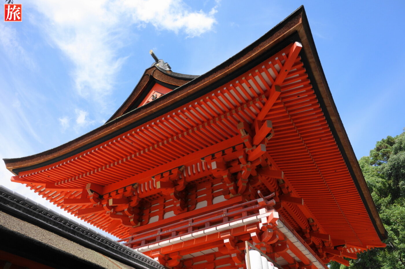 朱塗りの鮮やかな楼門。見上げてみると空とのコントラストが美しい。