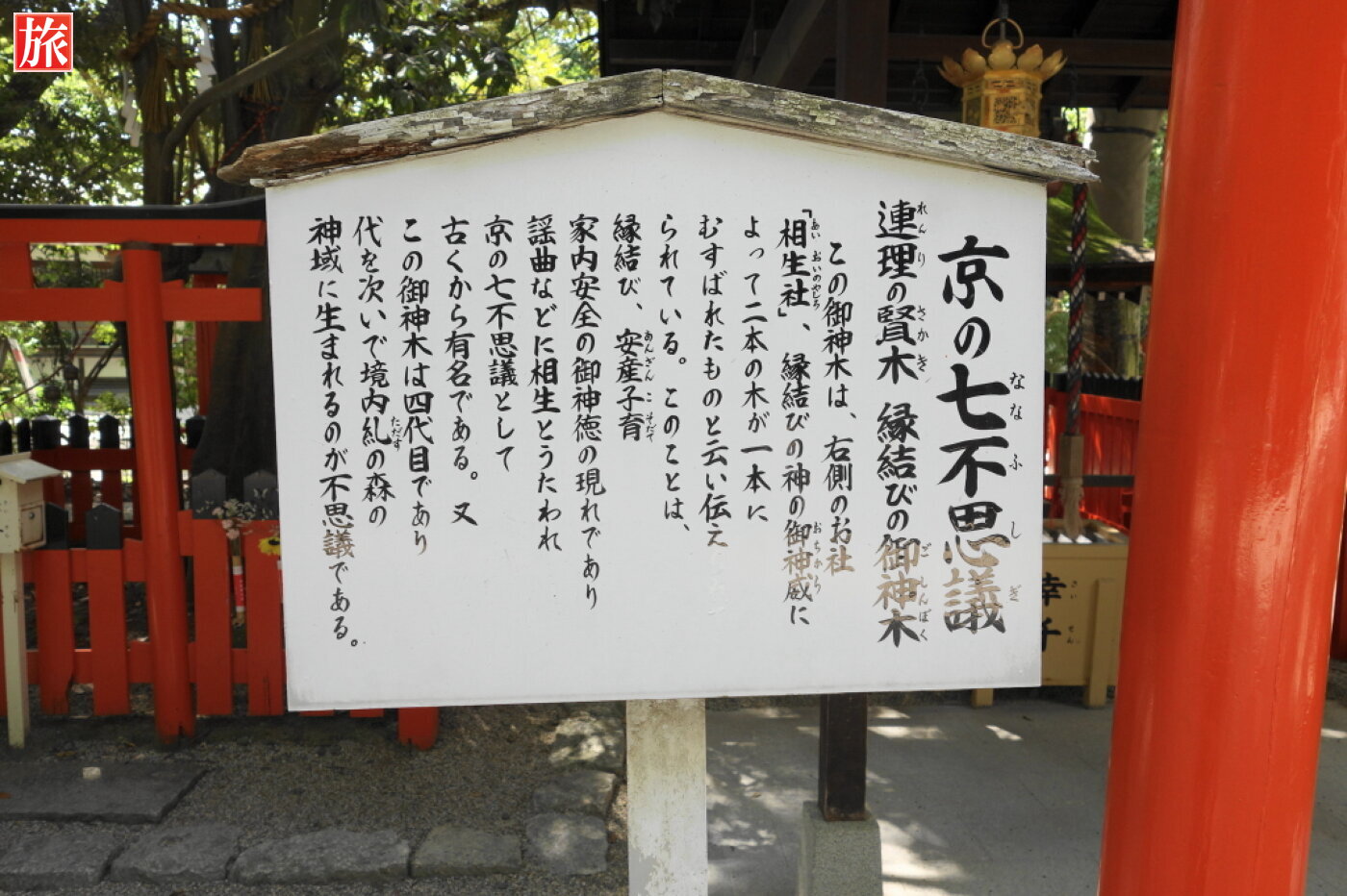 縁結びの御神木は「京の七不思議」の一つに数えられているそうです。このご神木は、えんむすびのお社のご神徳のあらわれとして、2本の木が途中から1本になってしまったとのこと。縁結び、安産子育、家内安全の御神徳の現れであるといわれているそうです。御神木は四代目とされ、枯れた後も代を次いで、御神木が糺の森の神域に生まれるといわれ、京の七不思議として古くから有名です。