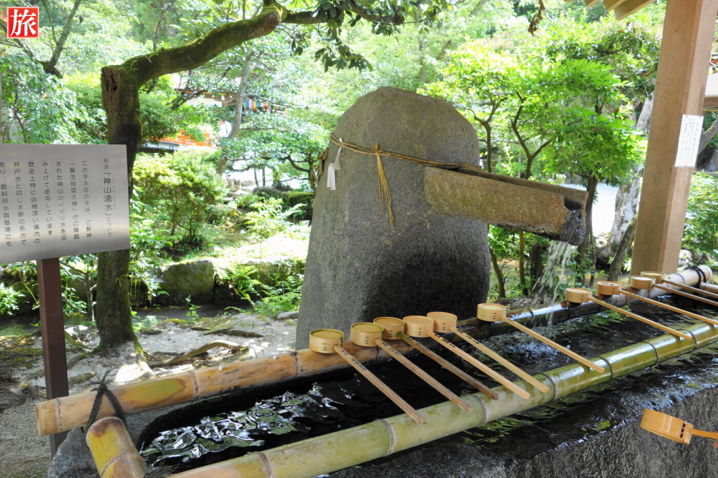 手水舎。名水「神山湧水」の説明板。石橋を渡り進みます。