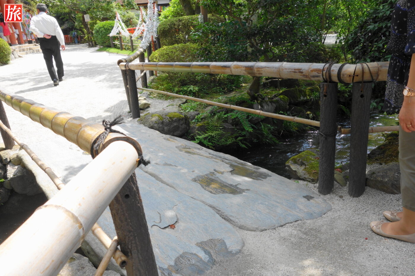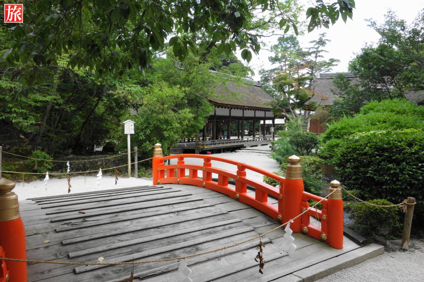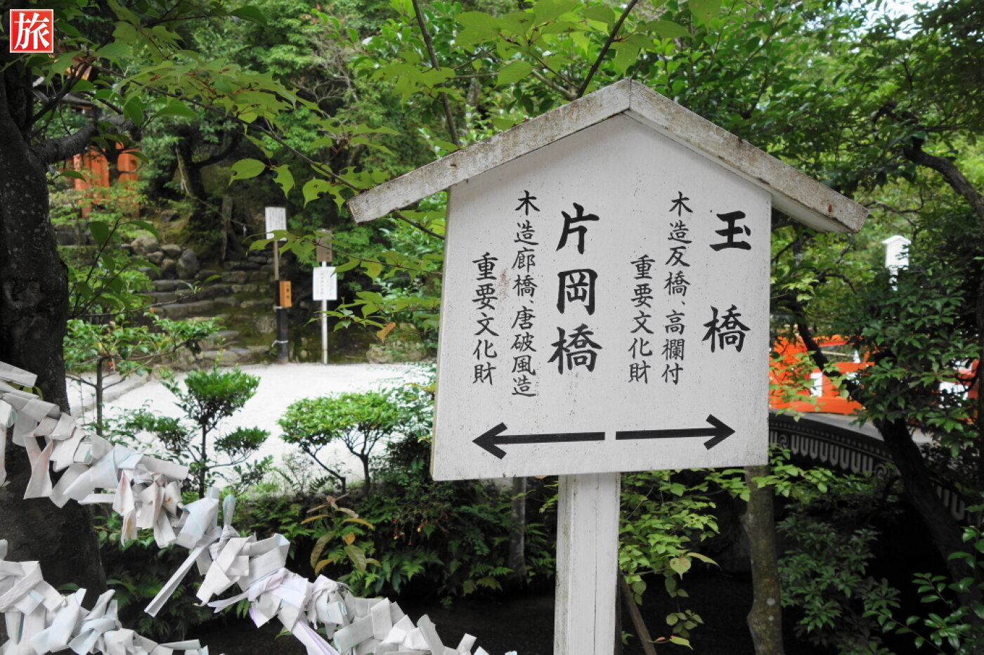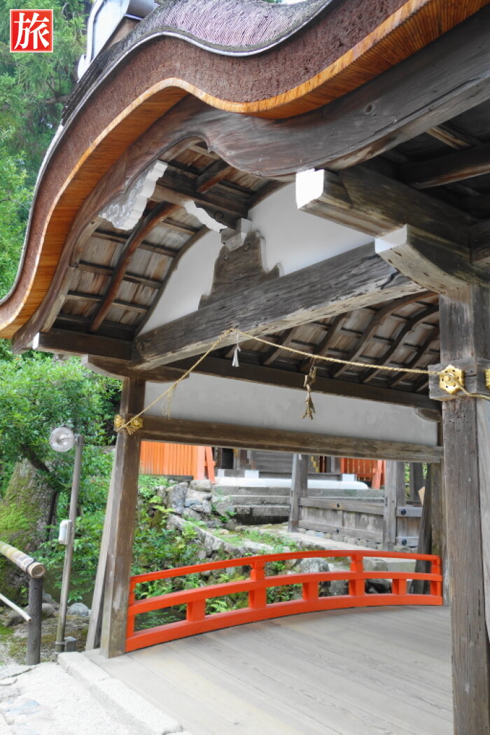 神事で神官が渡る際にのみ使われ、普段はしめ縄が張られて一般の人は通れないようになっている玉橋。右は、片岡橋で1628年造営、御物忌川に架かる唐破風屋根の木造廊橋。