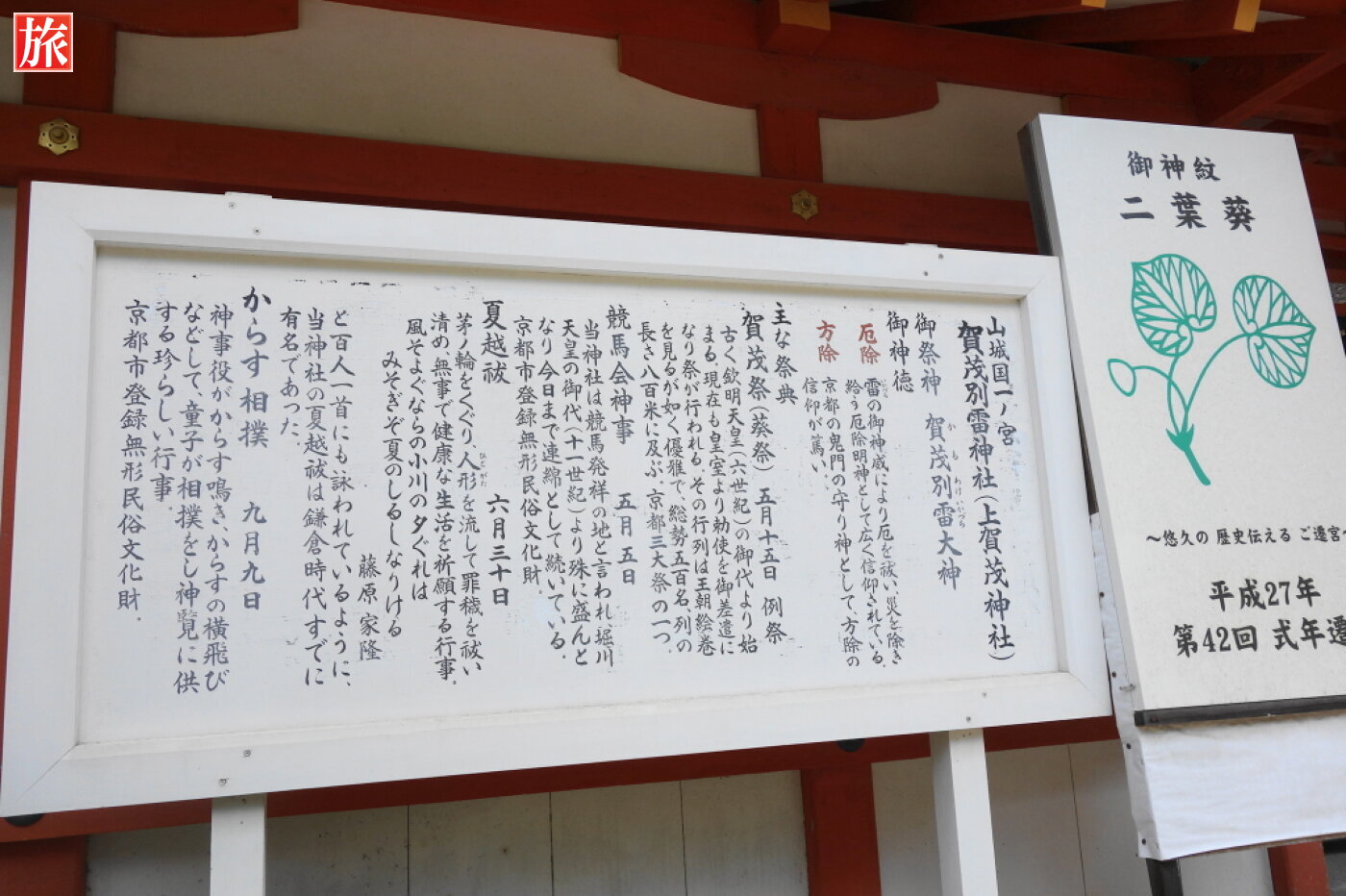 祭神は賀茂別雷大神。5月15日には京都の三大祭の一つ、賀茂祭(通称 葵祭)※(1)が行われる。