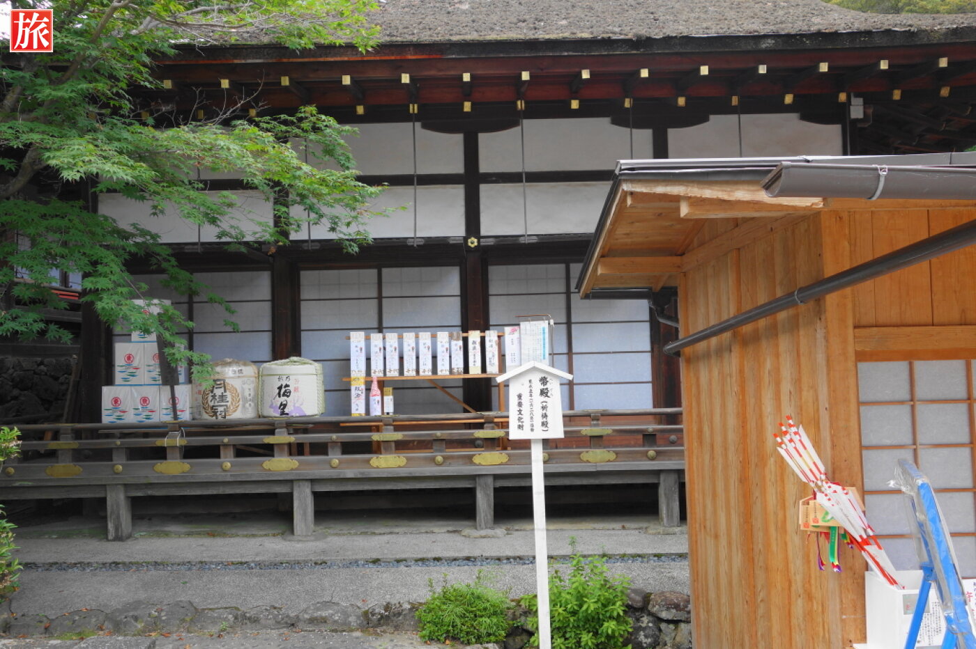 左から細殿・橋殿・土舎。楽舎(楽屋)1628年建造。土舎(到着殿)1628年建造。ともに重要文化財(国指定)
