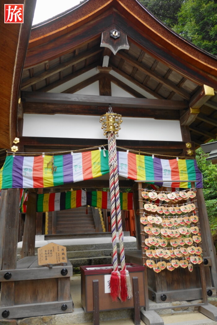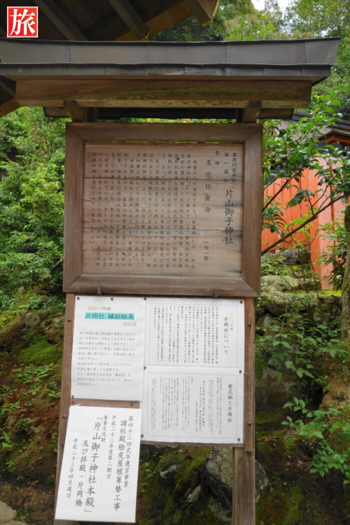 玉橋・片岡橋の案内板。縁結びの神 片岡社。紫式部が何度もお参りしたことでも知られている。