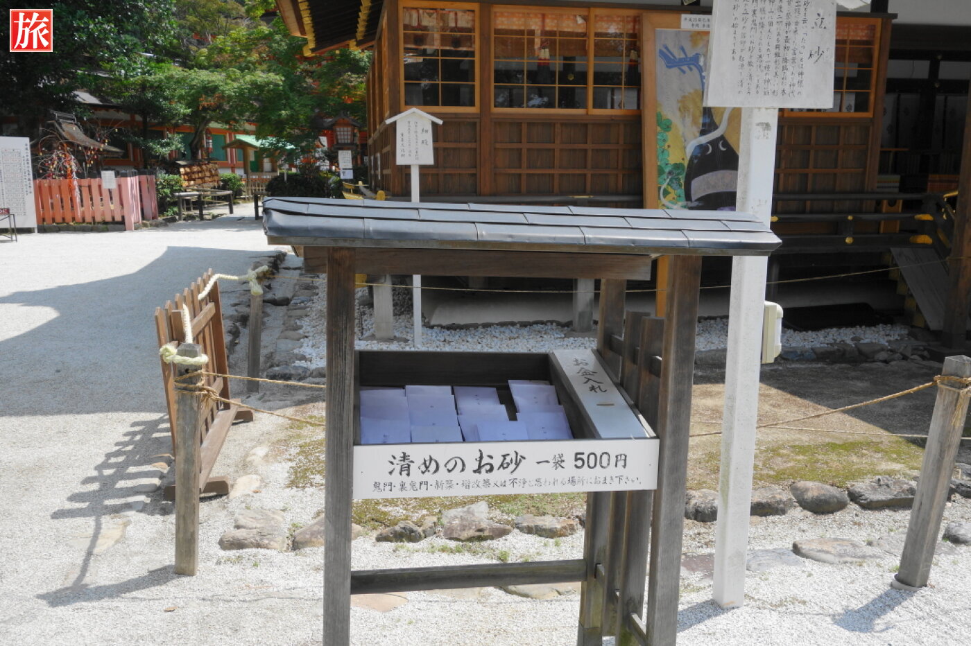 細殿と立砂(たてずな)神体である神山(こうやま)を模したもの。清めのお砂が1袋500円で売っていました。細殿の左手にある授与所。